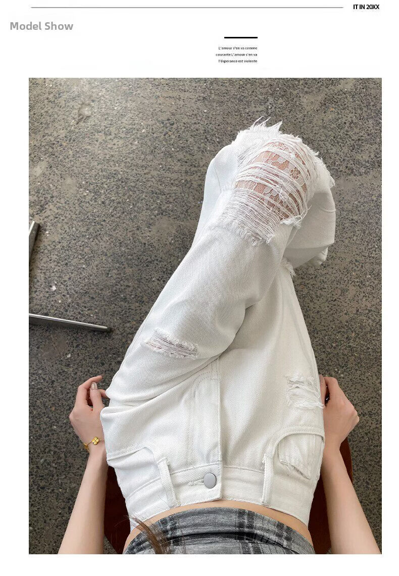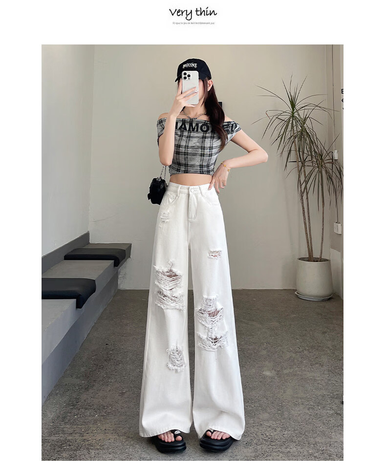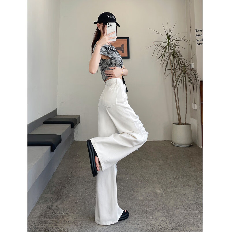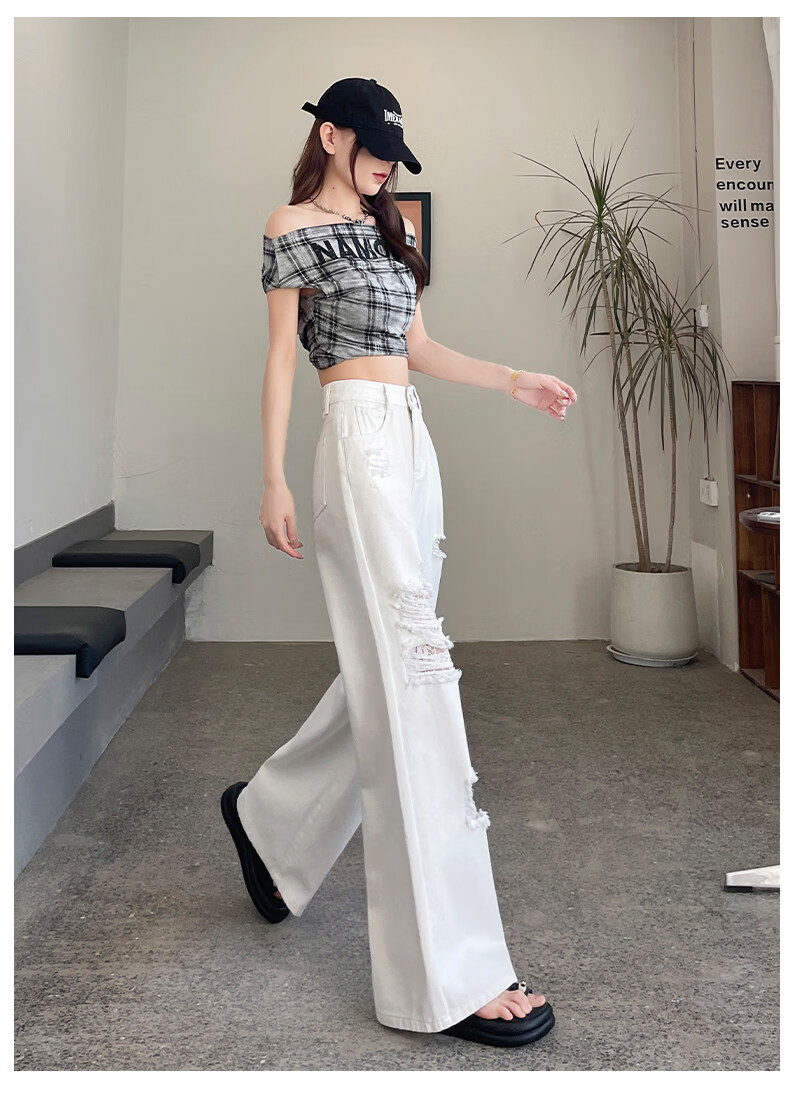 MODX2026夏季女性蕾丝破洞牛仔裤高腰纤细宽松流行的白色阔腿裤 白色【长裤】 XS