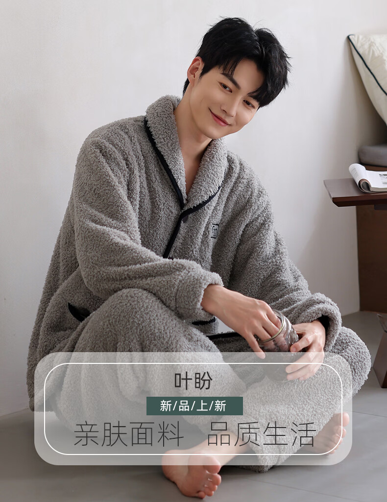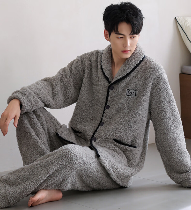 叶盼(yepan)【保暖】羊羔绒睡衣男冬季宽松大码高级感冬天加绒加厚家居服套装 9060-烟灰 M (165) :建议100-120斤穿着