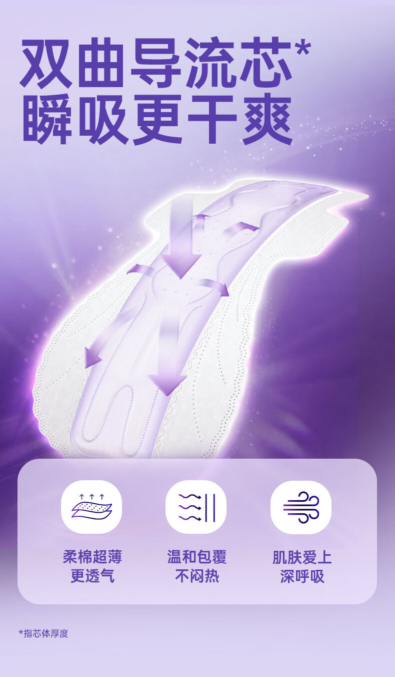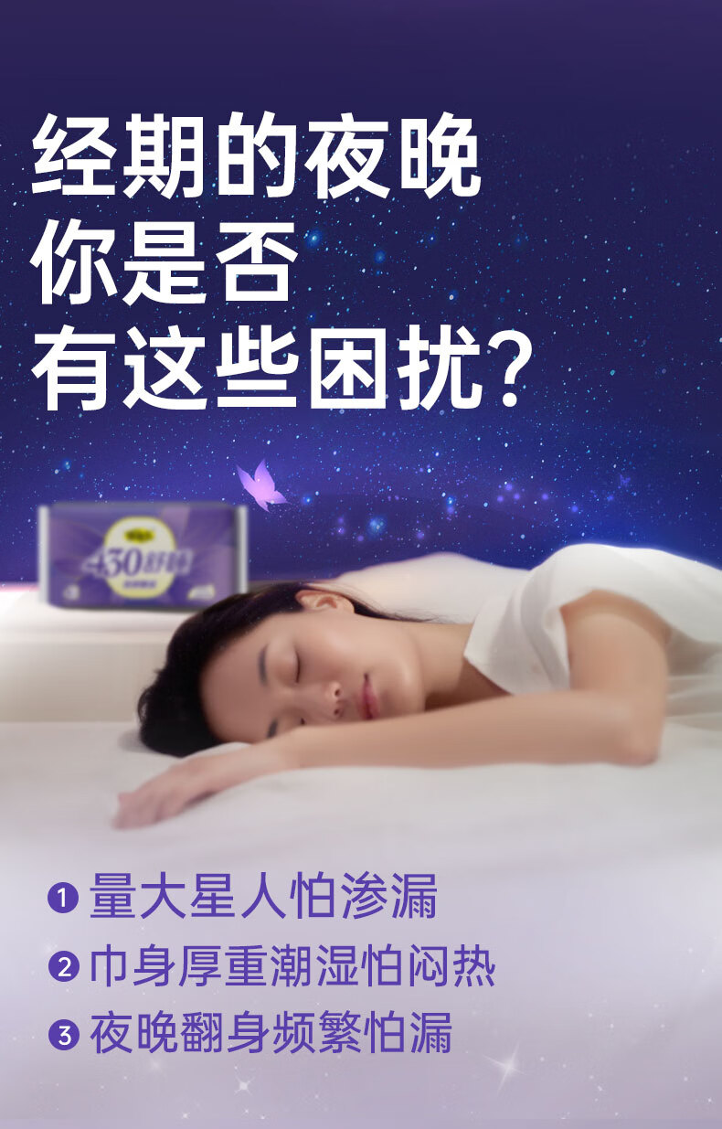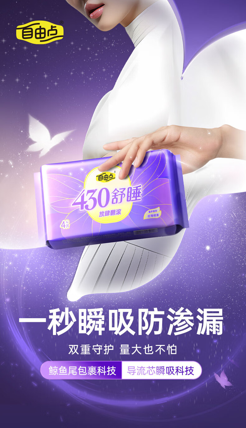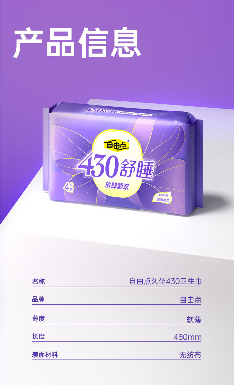 自由点超长夜用舒睡卫生巾 超薄棉柔透气姨妈巾 430mm4包16片 京东自营