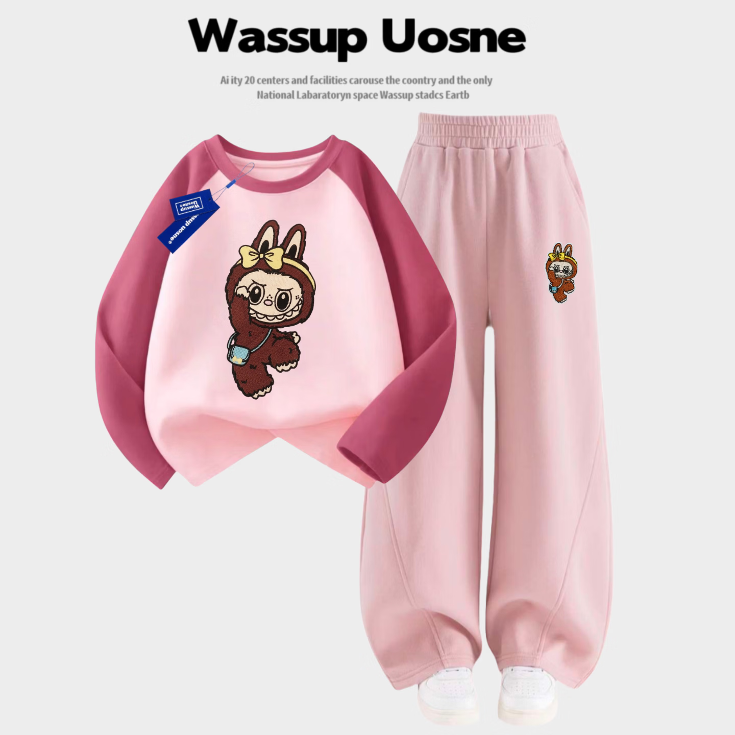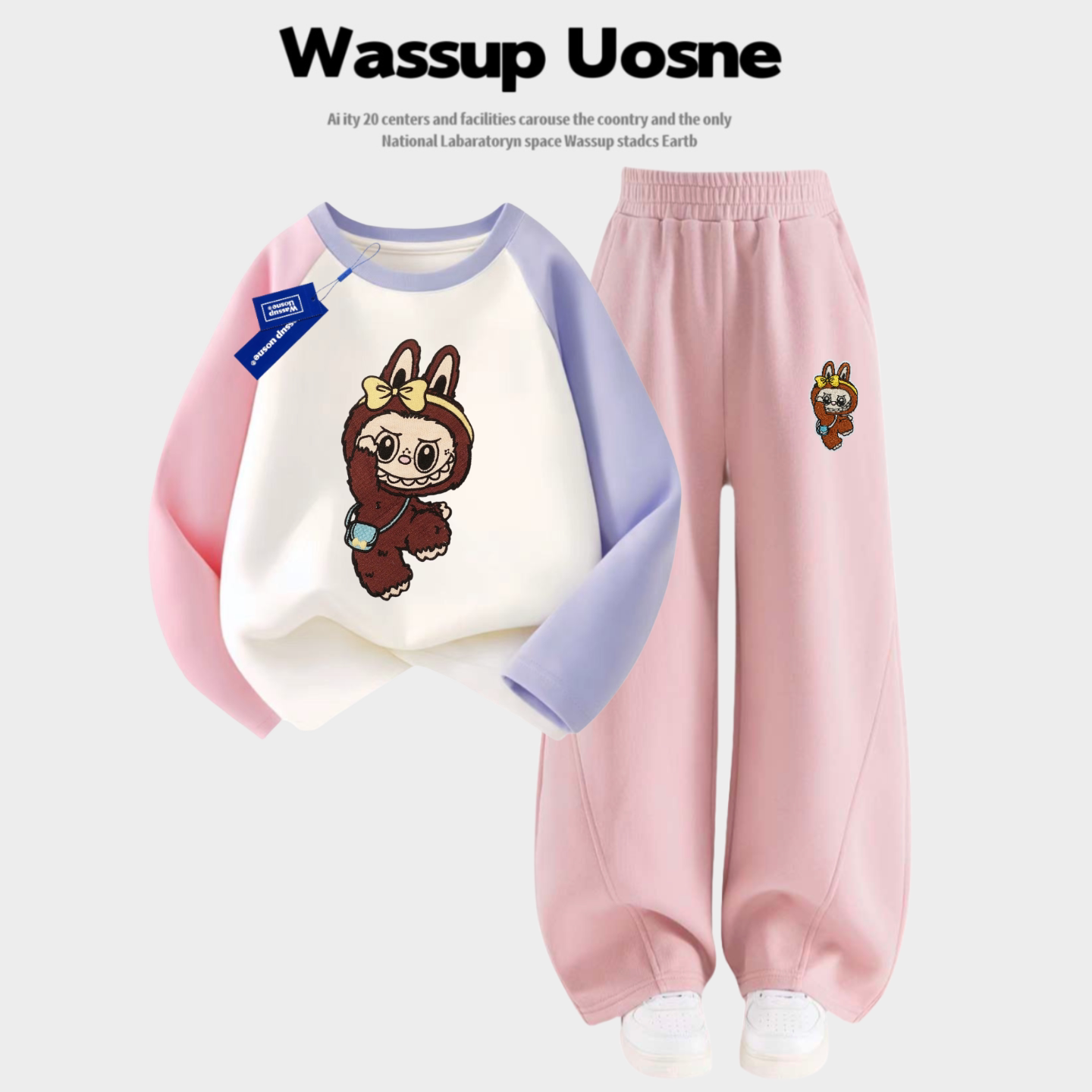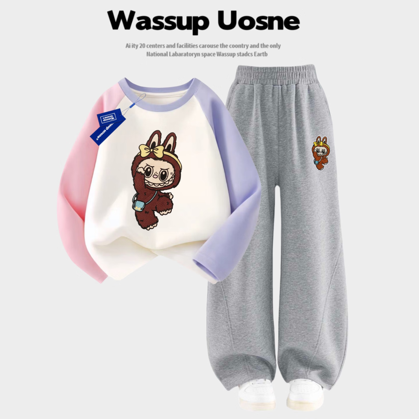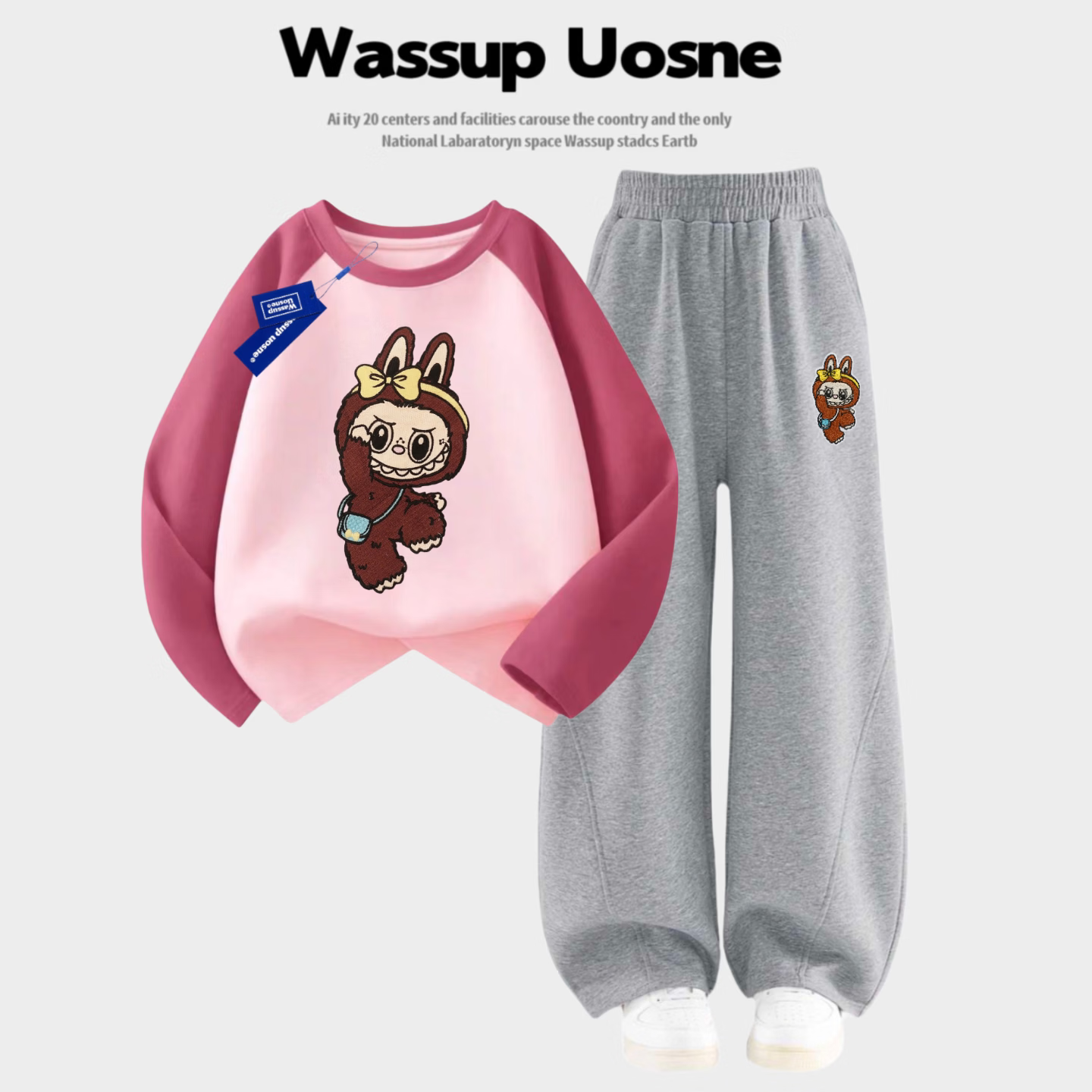 WASSUP联名拉布布小咖挎包布贴圆领可爱春秋季男女童长袖T恤卫裤 藕粉弯刀卫裤 160
