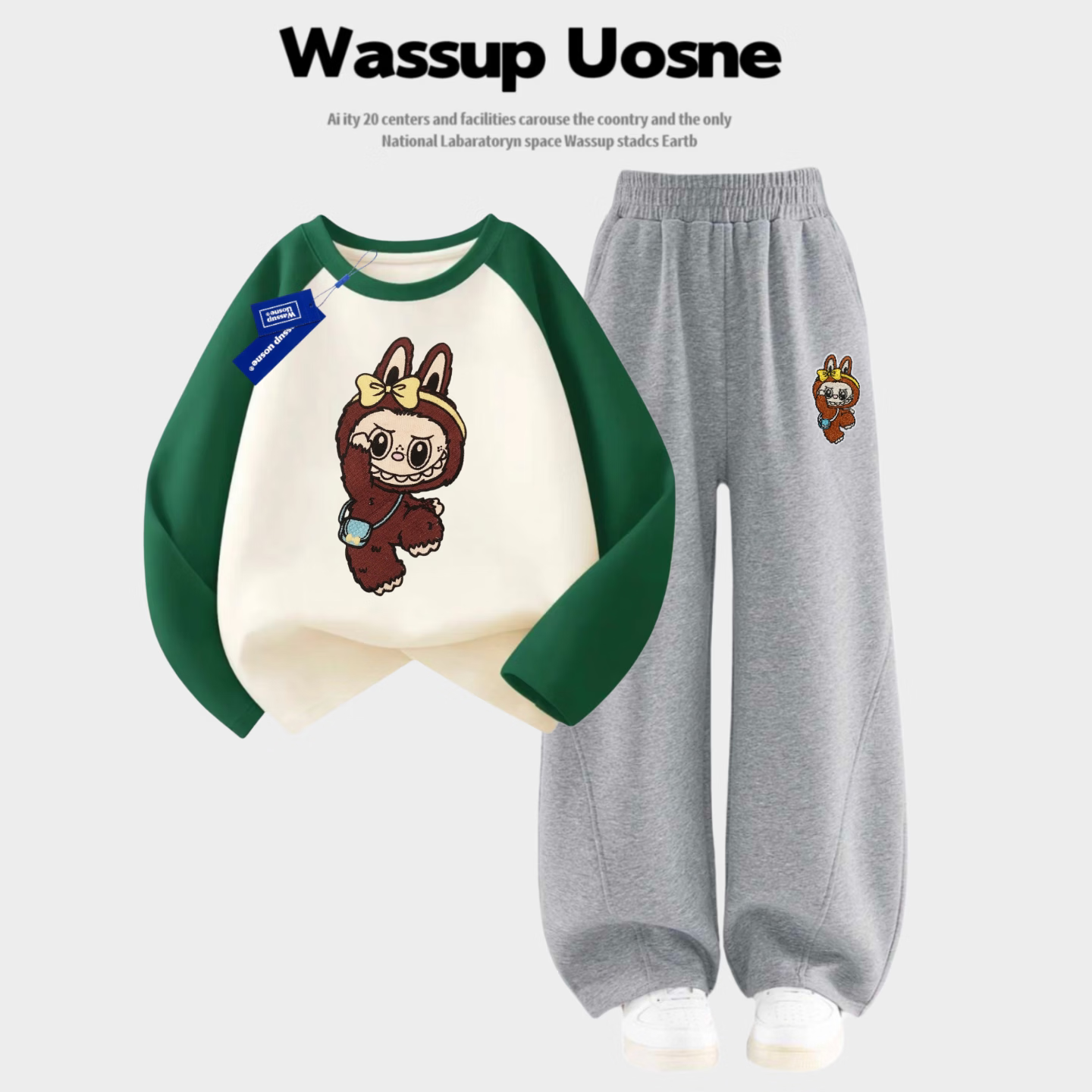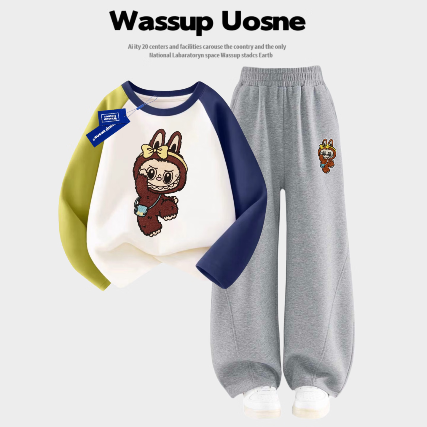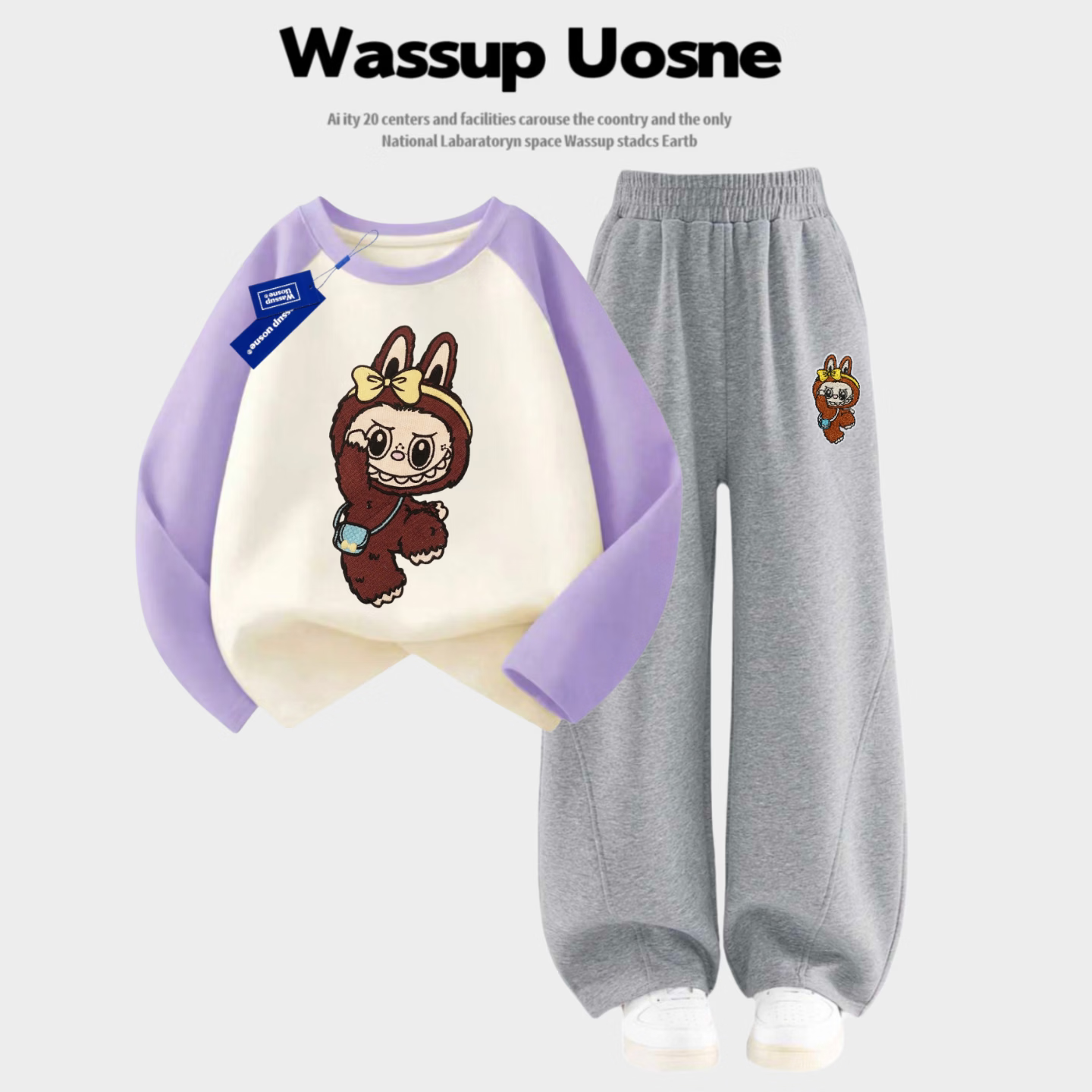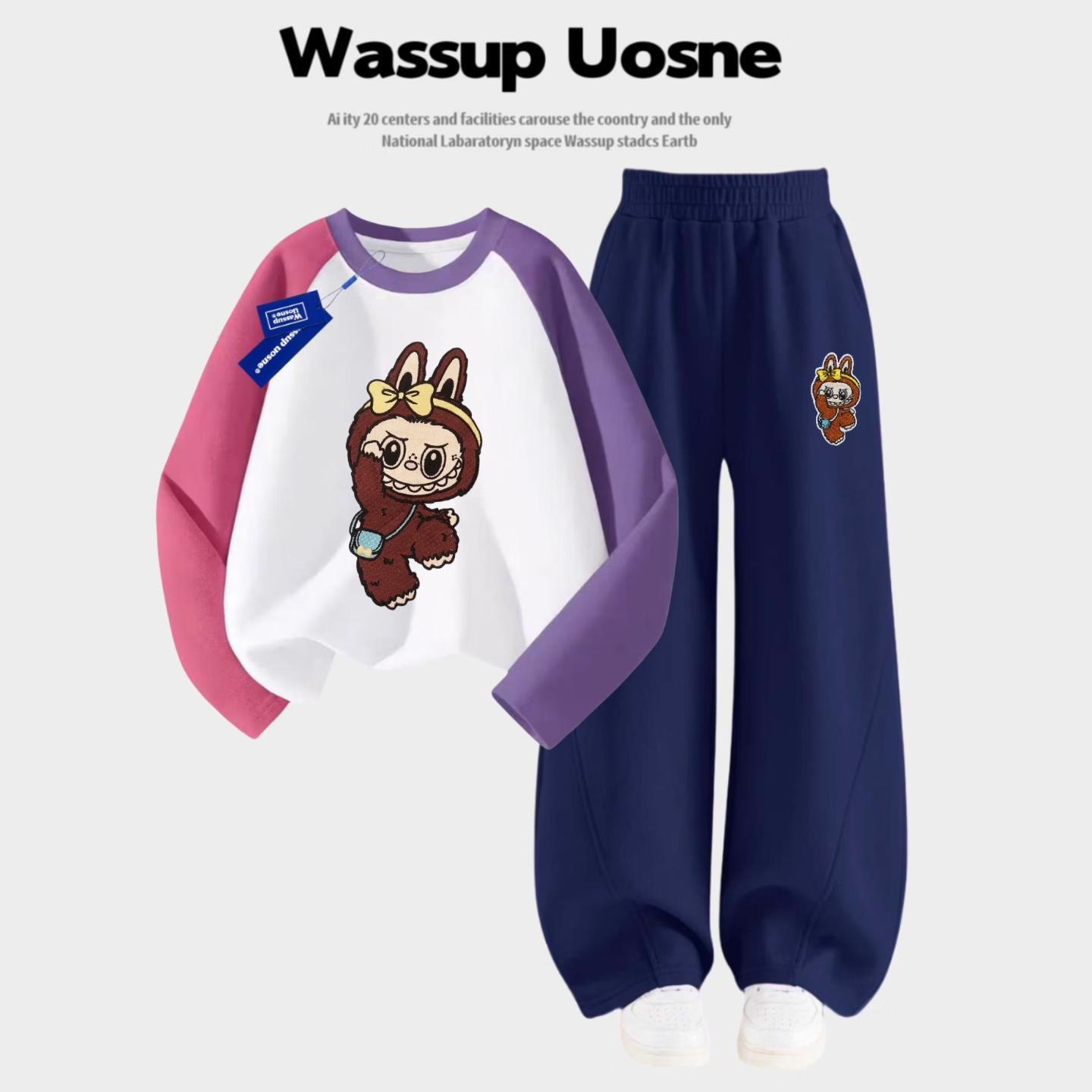 WASSUP联名拉布布小咖挎包布贴圆领可爱春秋季男女童长袖T恤卫裤 藕粉弯刀卫裤 160