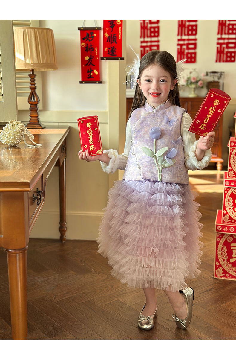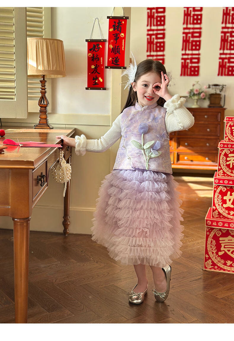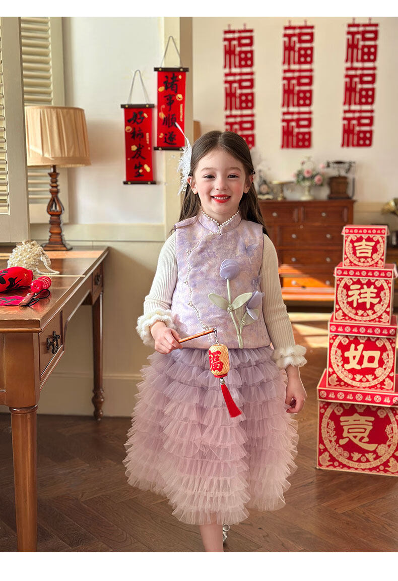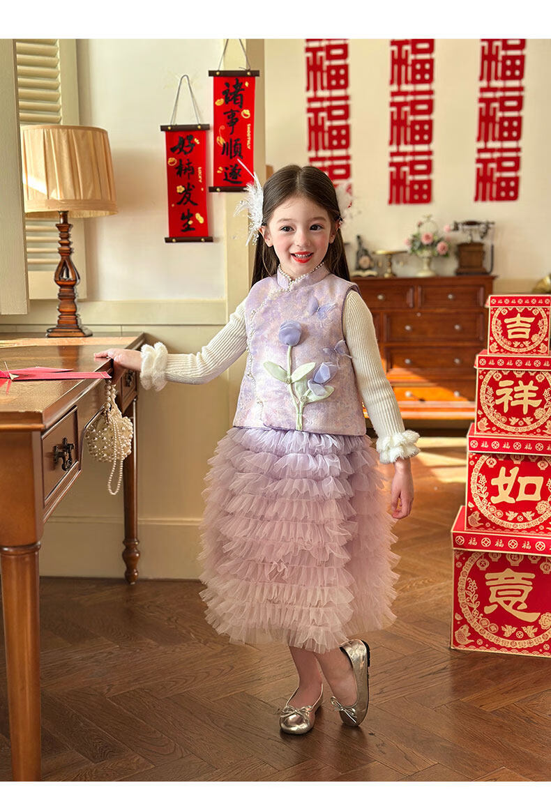 栀了成长记童装女童花朵马甲套装2025冬季儿童新中式国风夹棉上衣 打底衫 120 cm