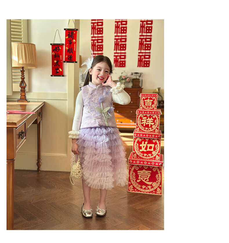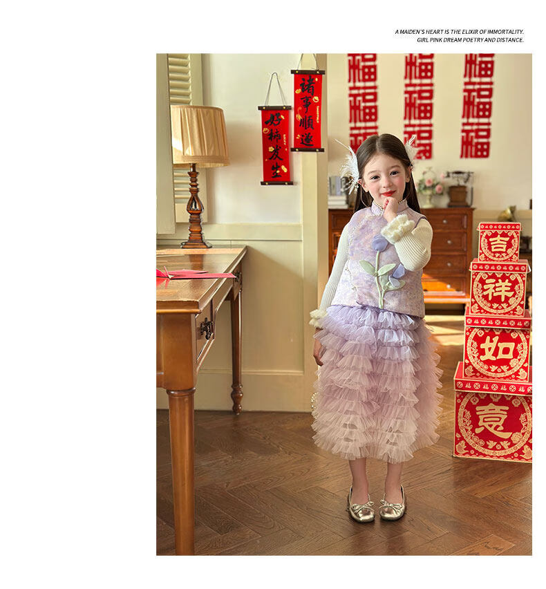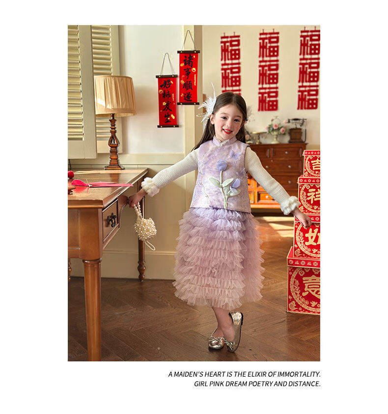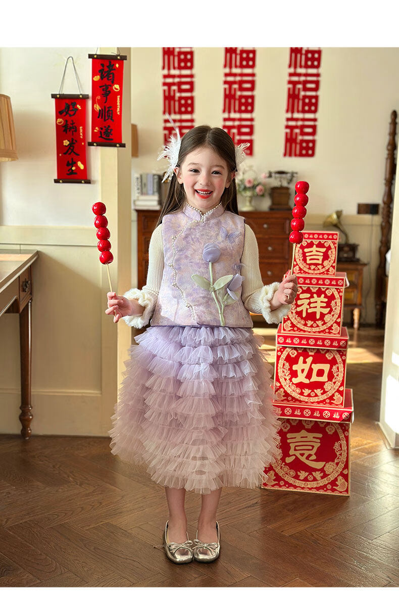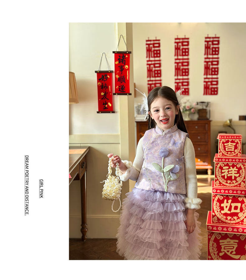 栀了成长记童装女童花朵马甲套装2025冬季儿童新中式国风夹棉上衣 打底衫 120 cm