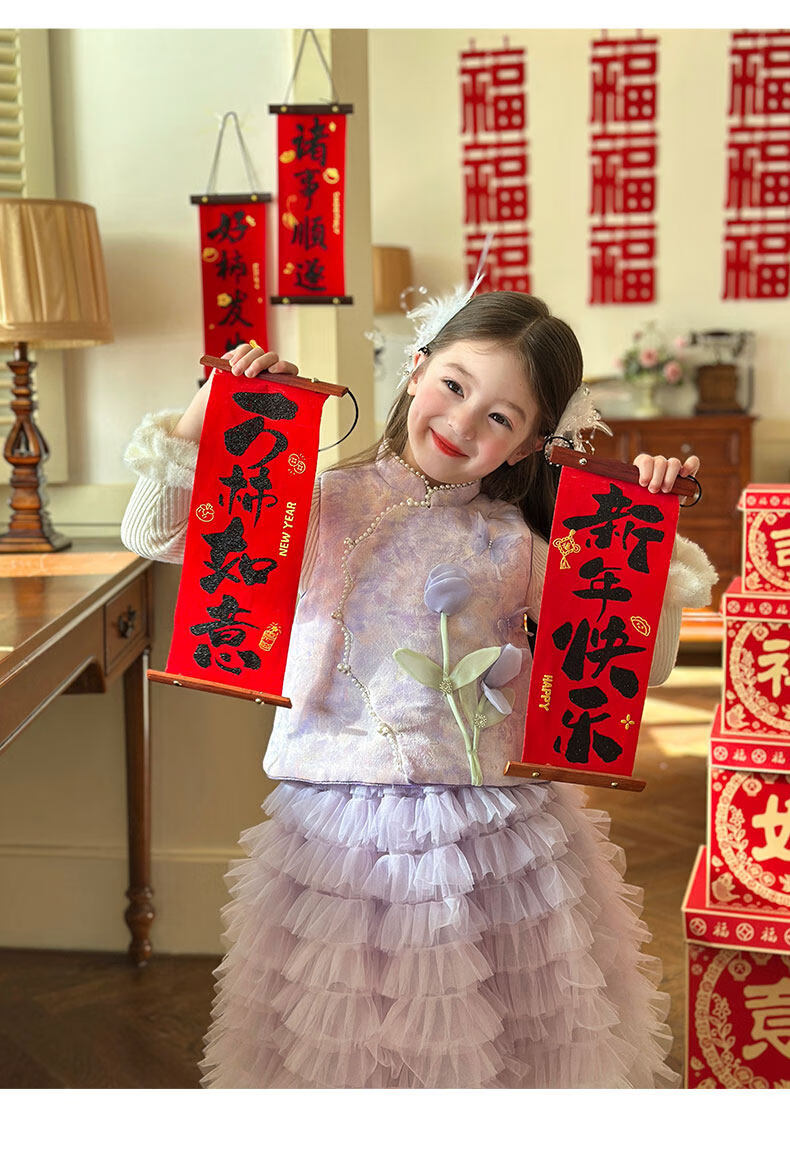 栀了成长记童装女童红色国风套装2025冬季儿童新年夹棉马甲两件套 红色 套装 100 cm