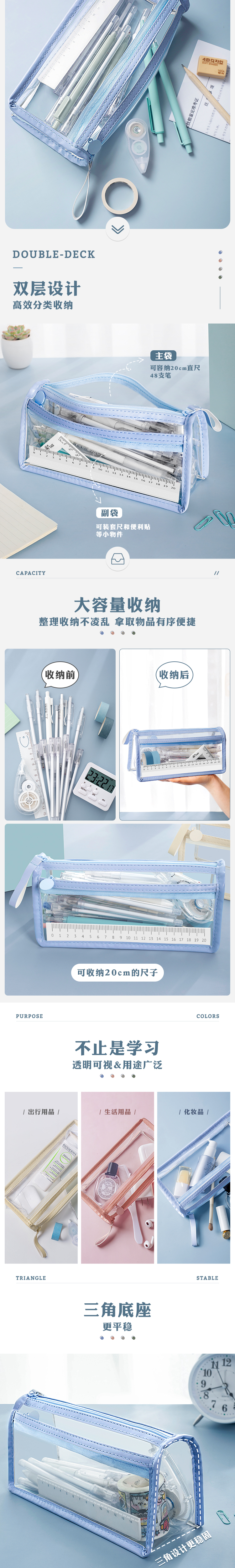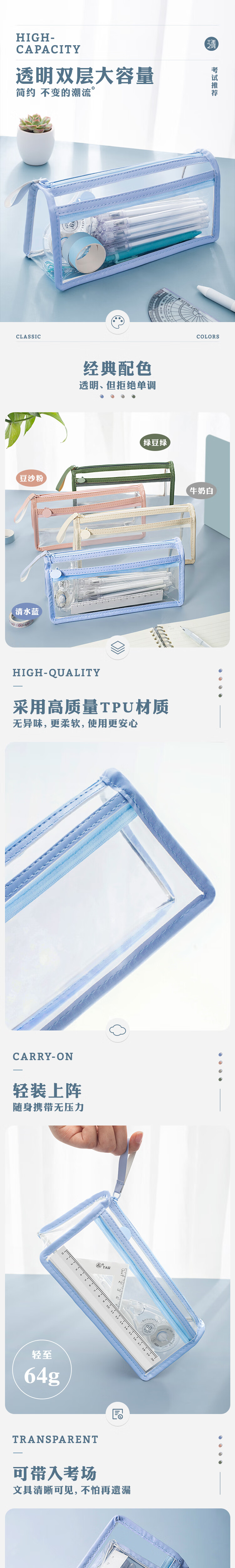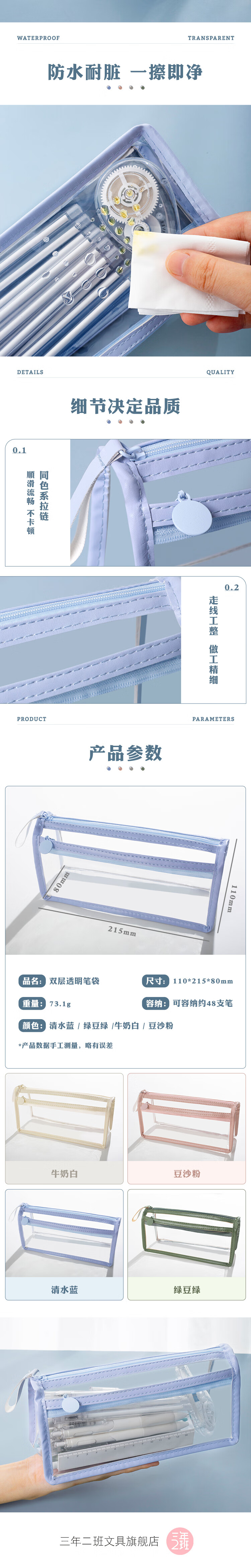 三年二班透明笔袋考试专用套装痛包大容量考试文具袋女小学生高颜值文具盒女孩男铅笔袋初中高中生考试笔袋 甘如清泉-清水蓝