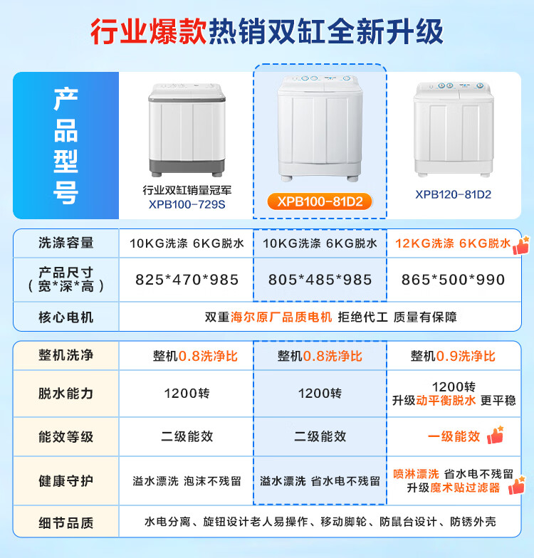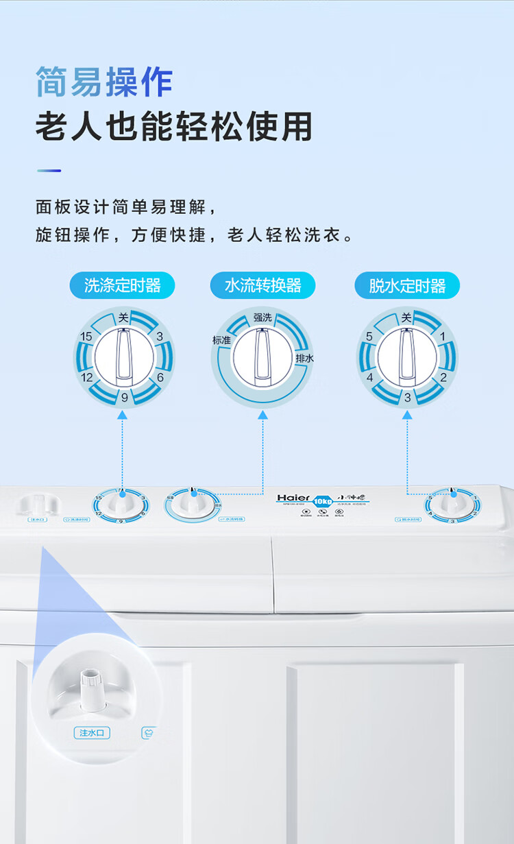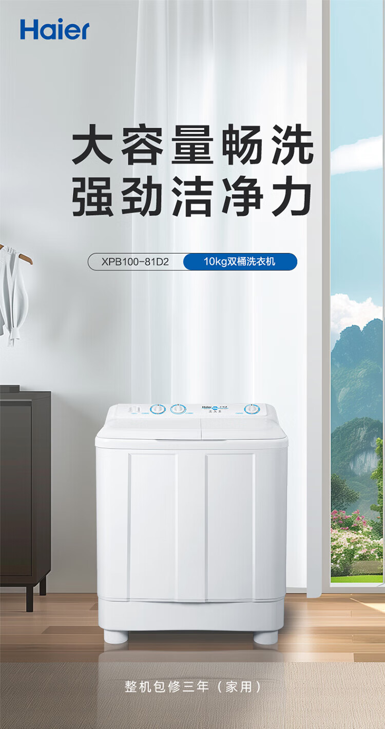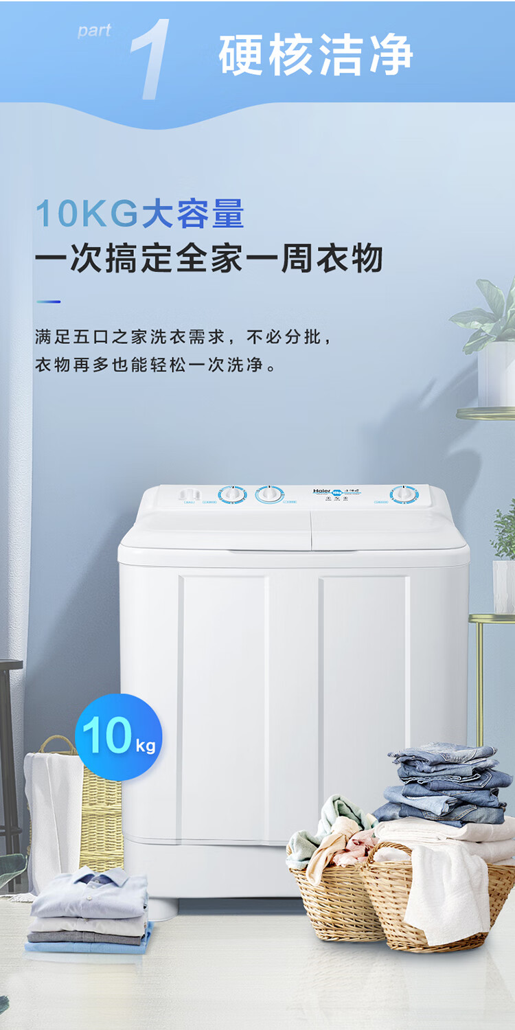海尔(Haier)半自动双桶洗衣机 10KG 双电机双缸 家电国家补贴以旧换新京东自营 XPB100-81D2