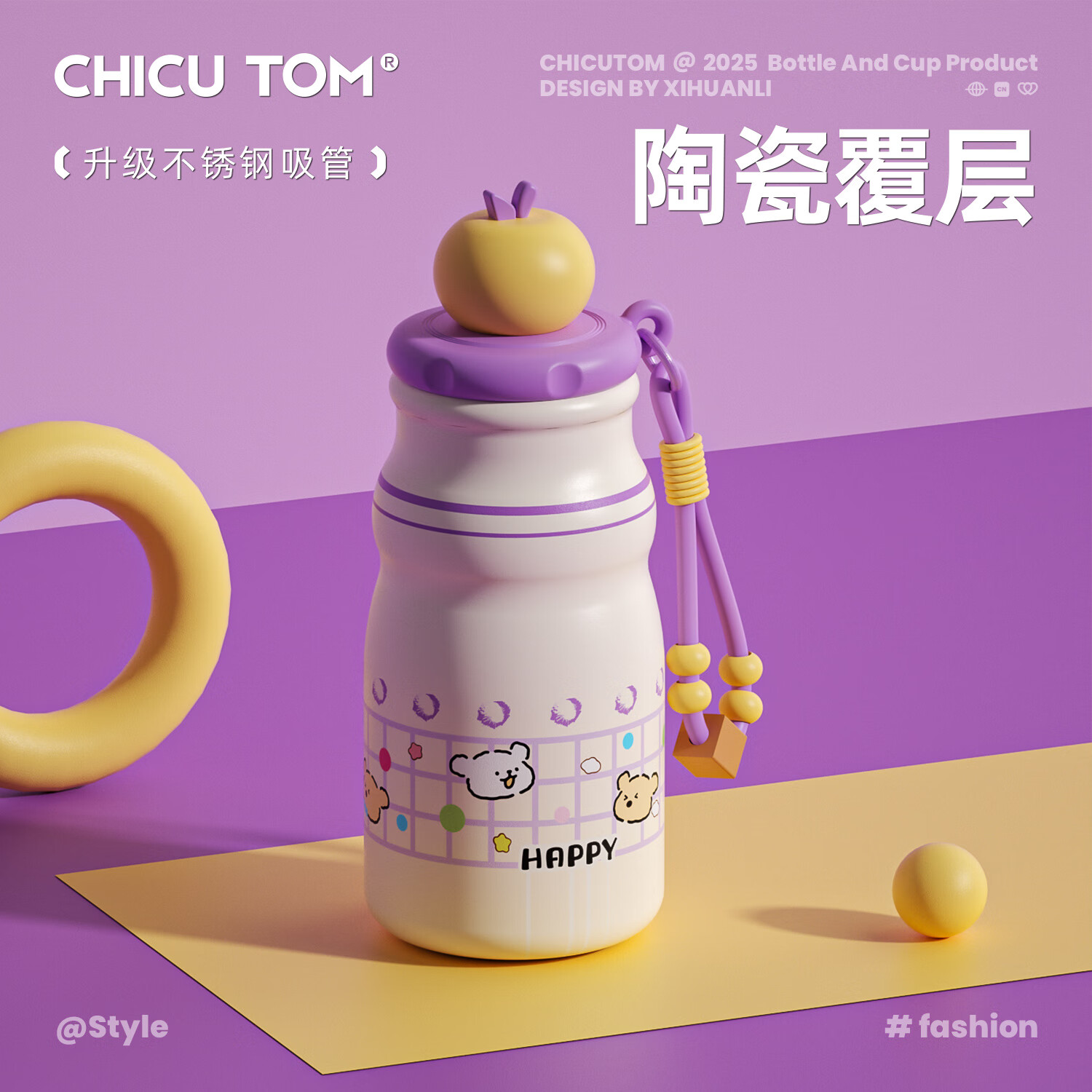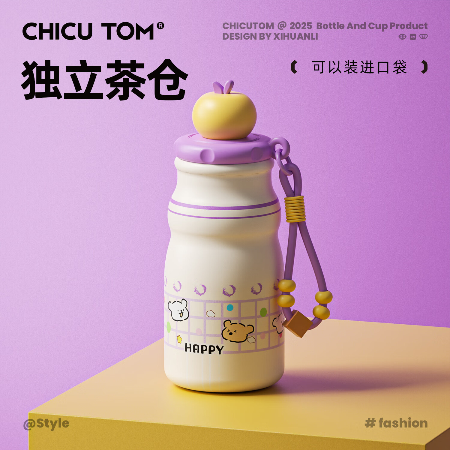 迷你保温杯小巧便携2025新款儿童女生吸管保温杯高颜值水杯 淡紫云朵格纹480ML【含茶漏】 316不锈钢