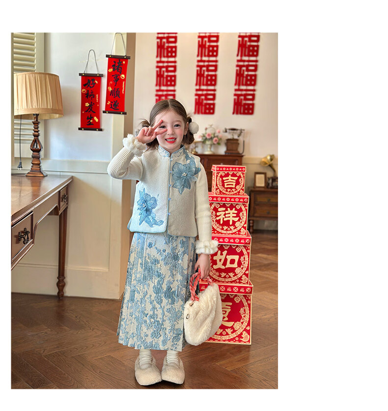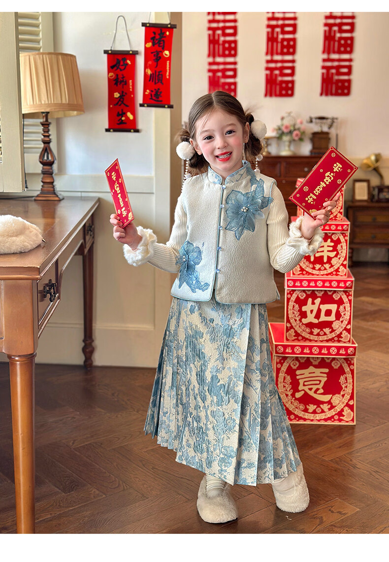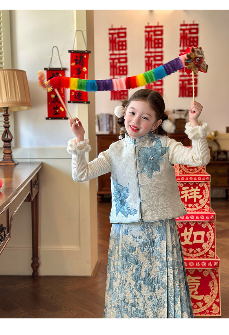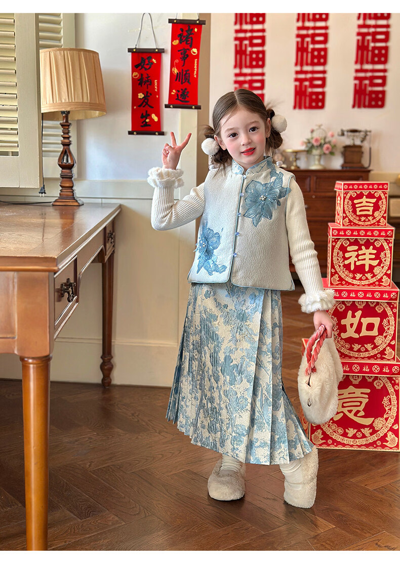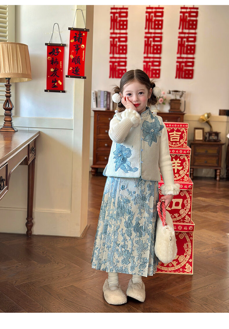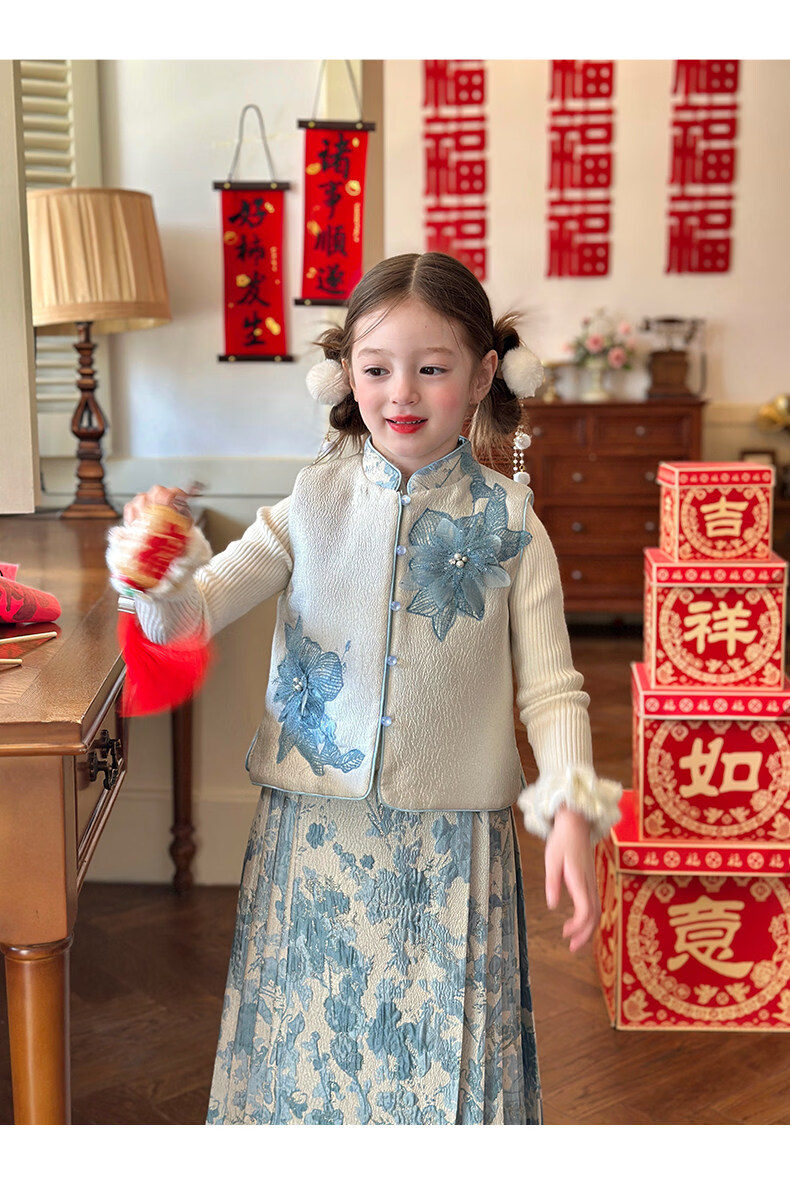 栀了成长记女童装国风撞色马甲套装2025冬季新中式淡雅加厚两件套 蓝色 套装 100 cm