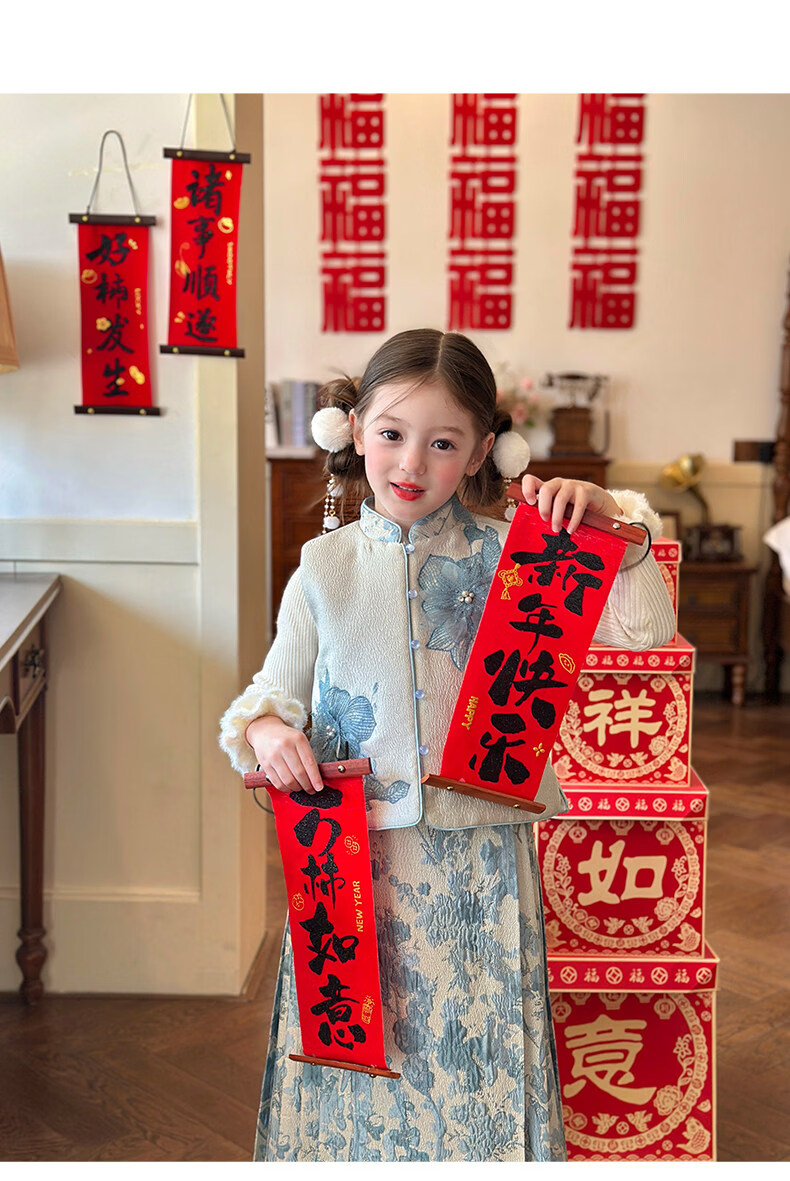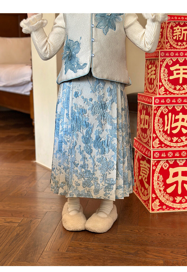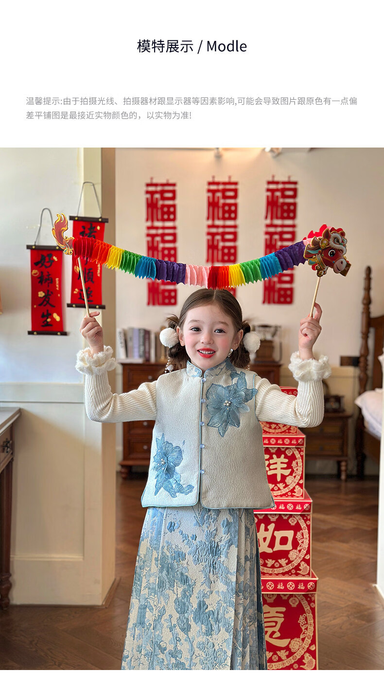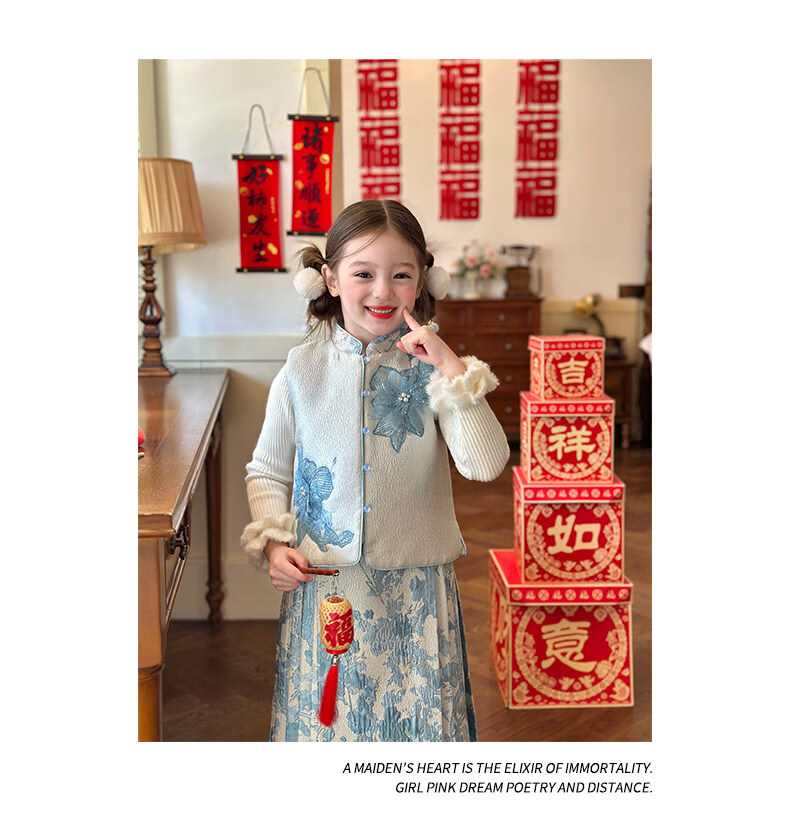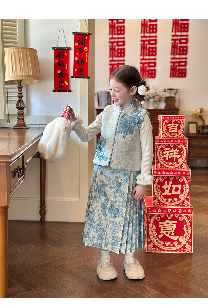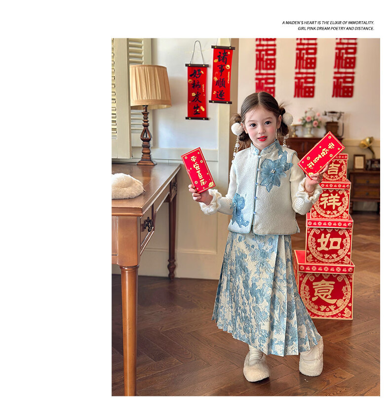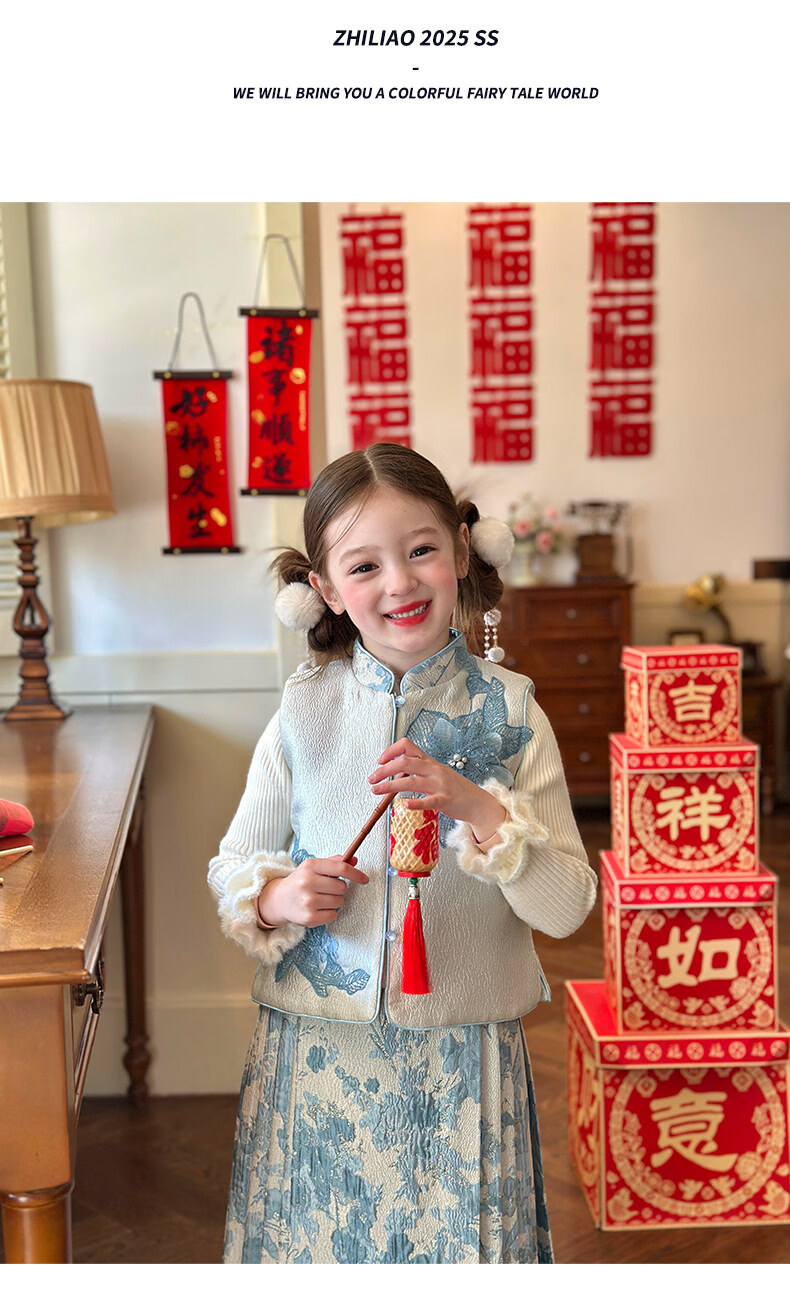 栀了成长记女童装国风撞色马甲套装2025冬季新中式淡雅加厚两件套 蓝色 套装 100 cm