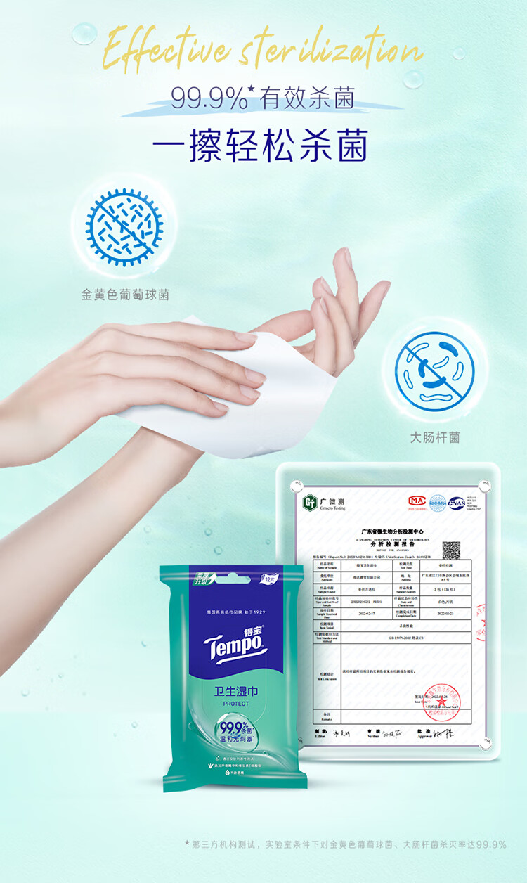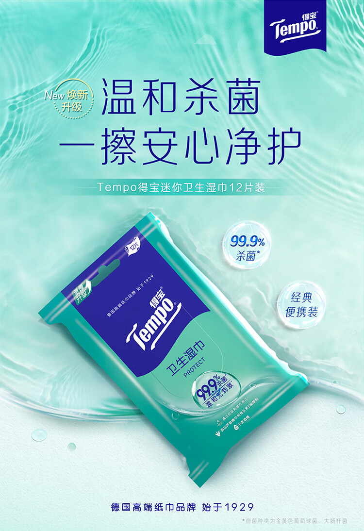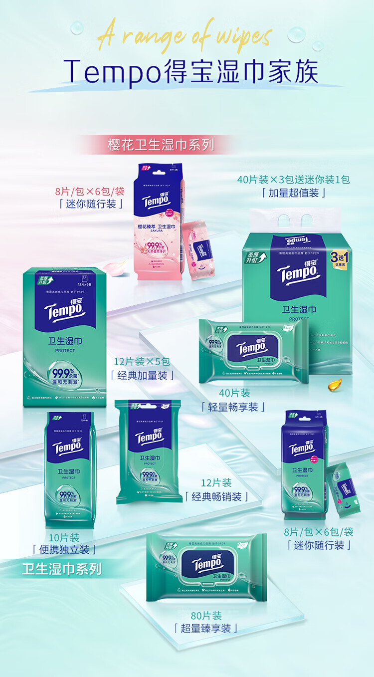 得宝(TEMPO)杀菌湿巾盒装 12片*5包 杀菌率99.9% 温和不刺激 湿纸巾