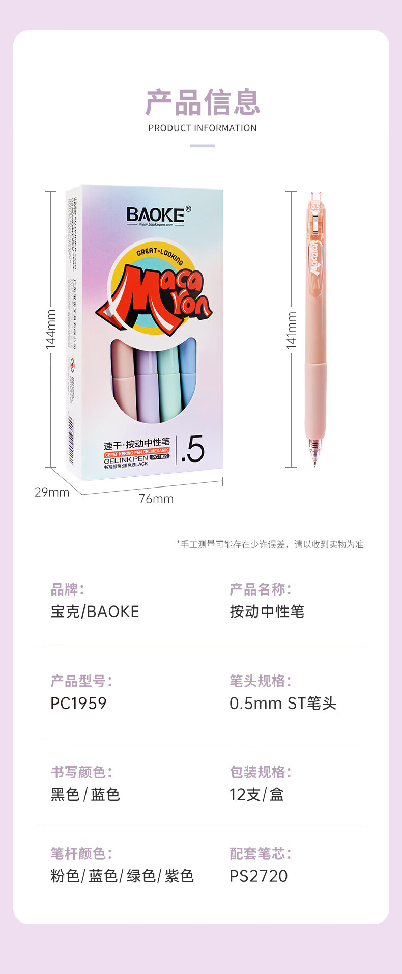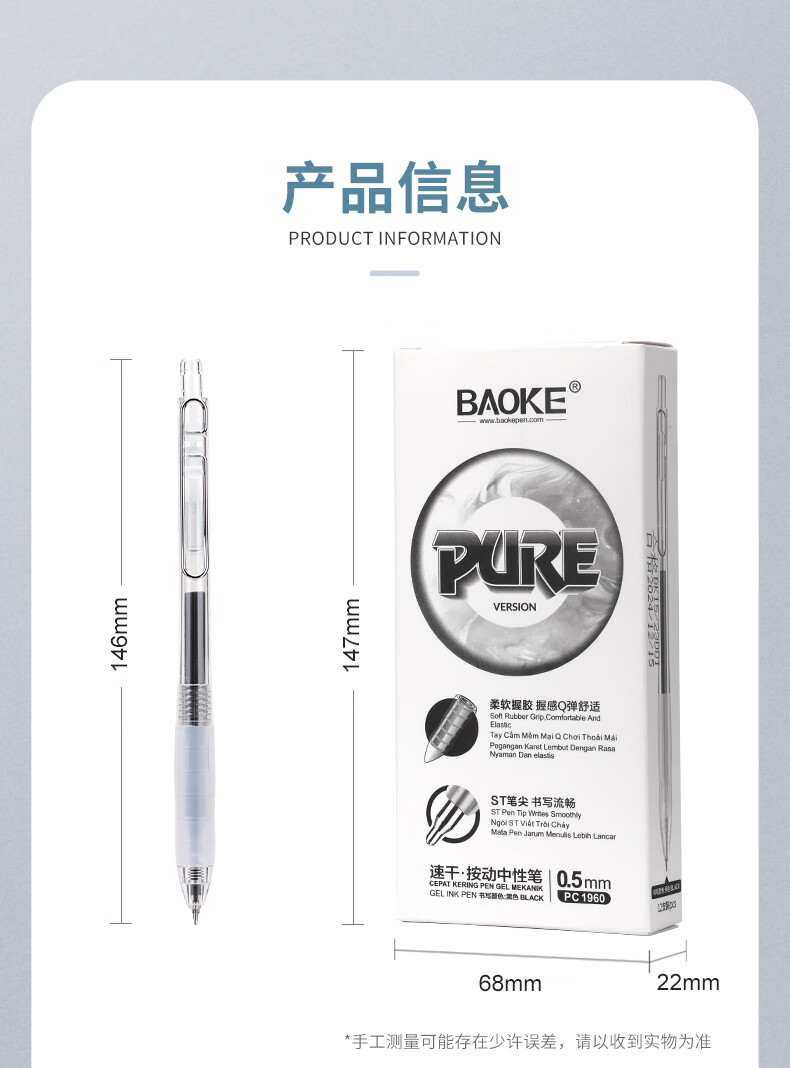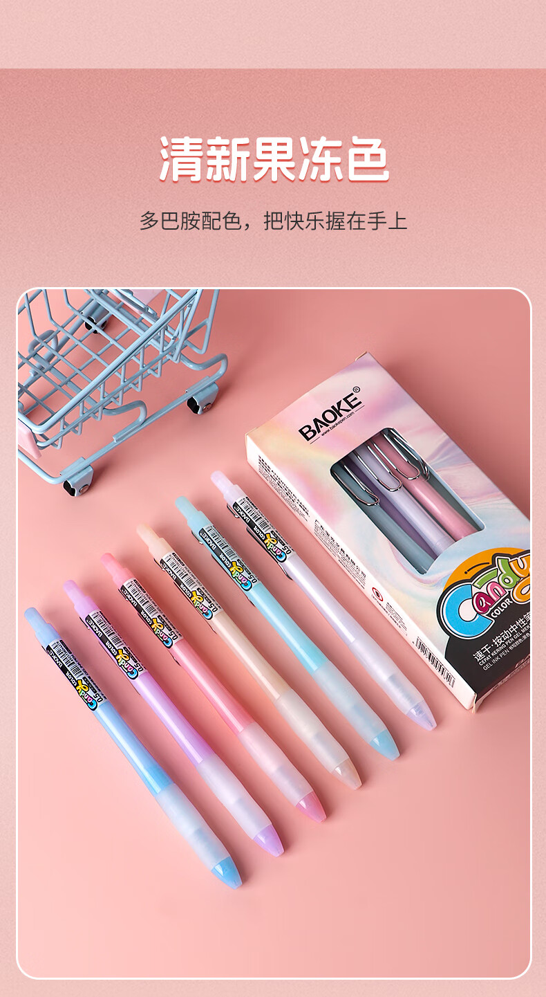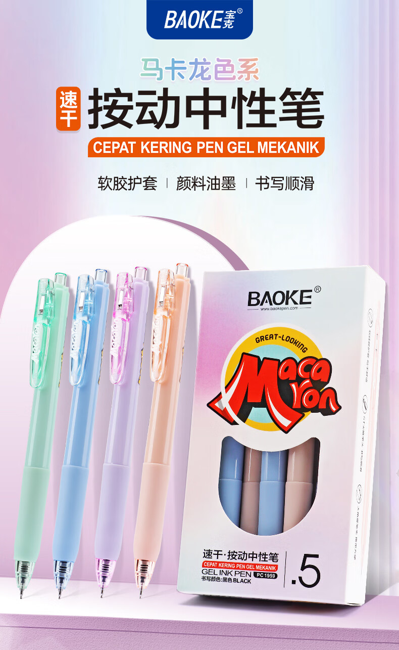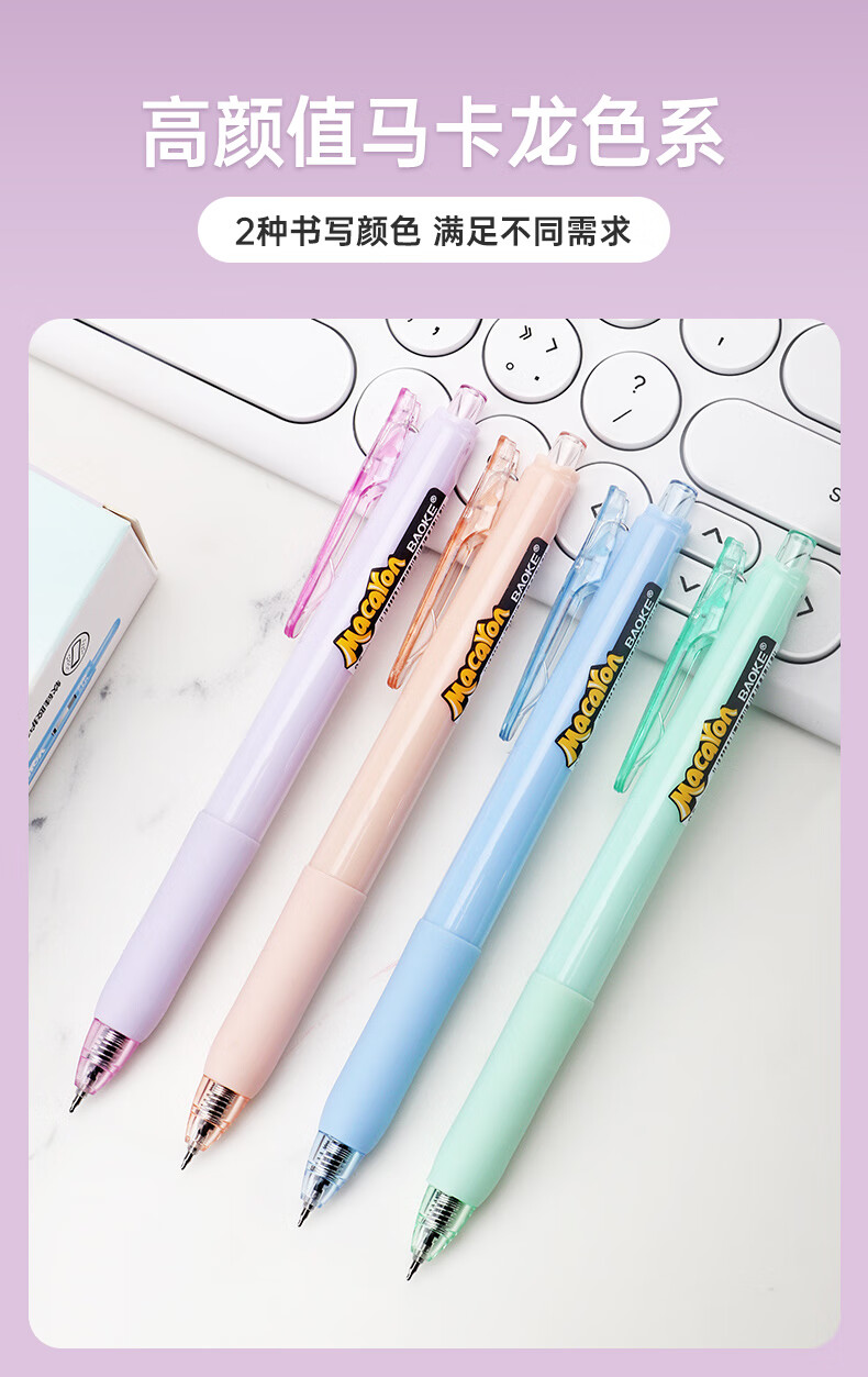 宝克(BAOKE)【开学】按动中性笔 ST笔尖0.5mm按动笔软胶护套高颜值学生中性笔刷题笔考试中考高考用签字笔办公 书写-黑色【高颜值马卡龙彩色笔杆】 12支装/盒【店长推荐】