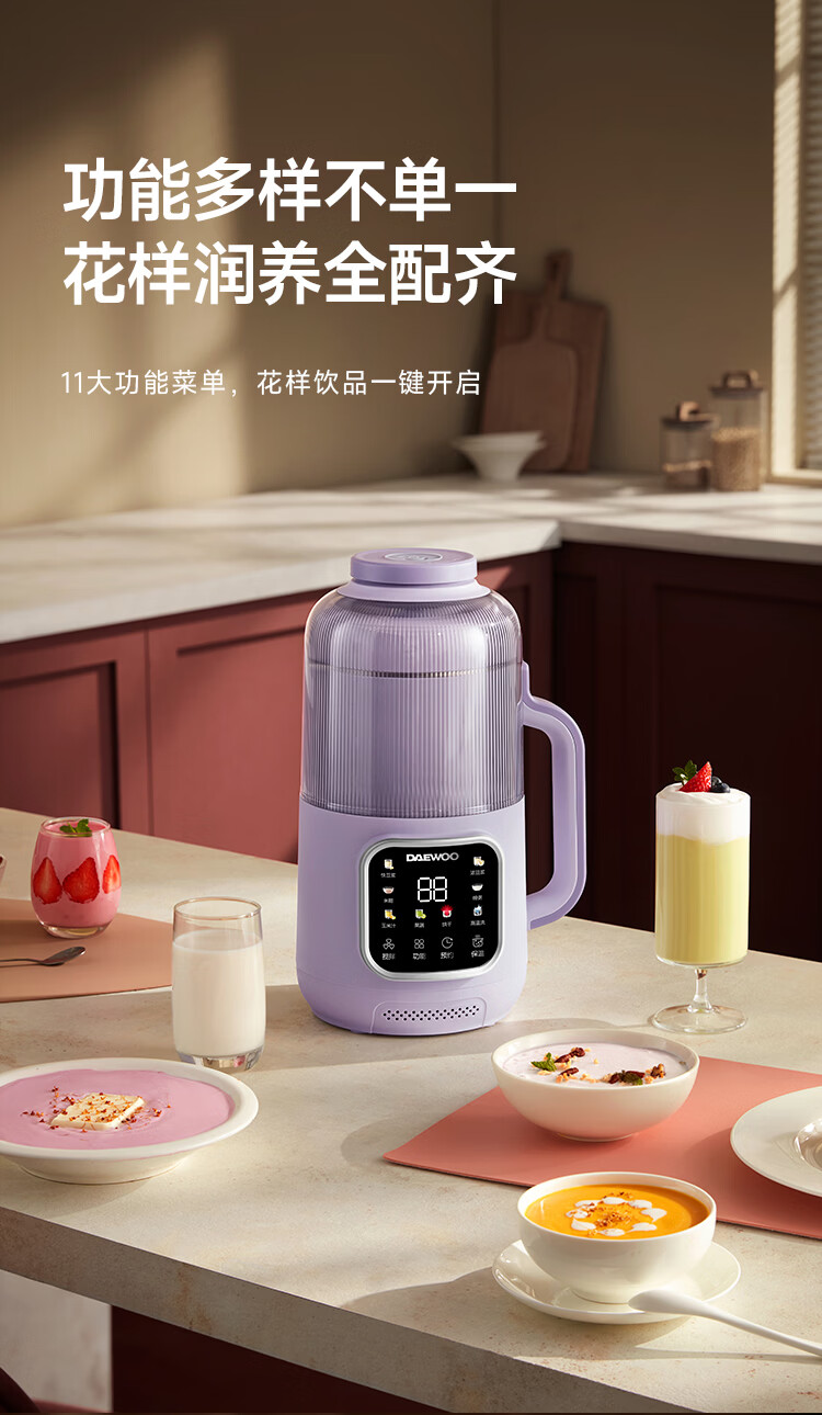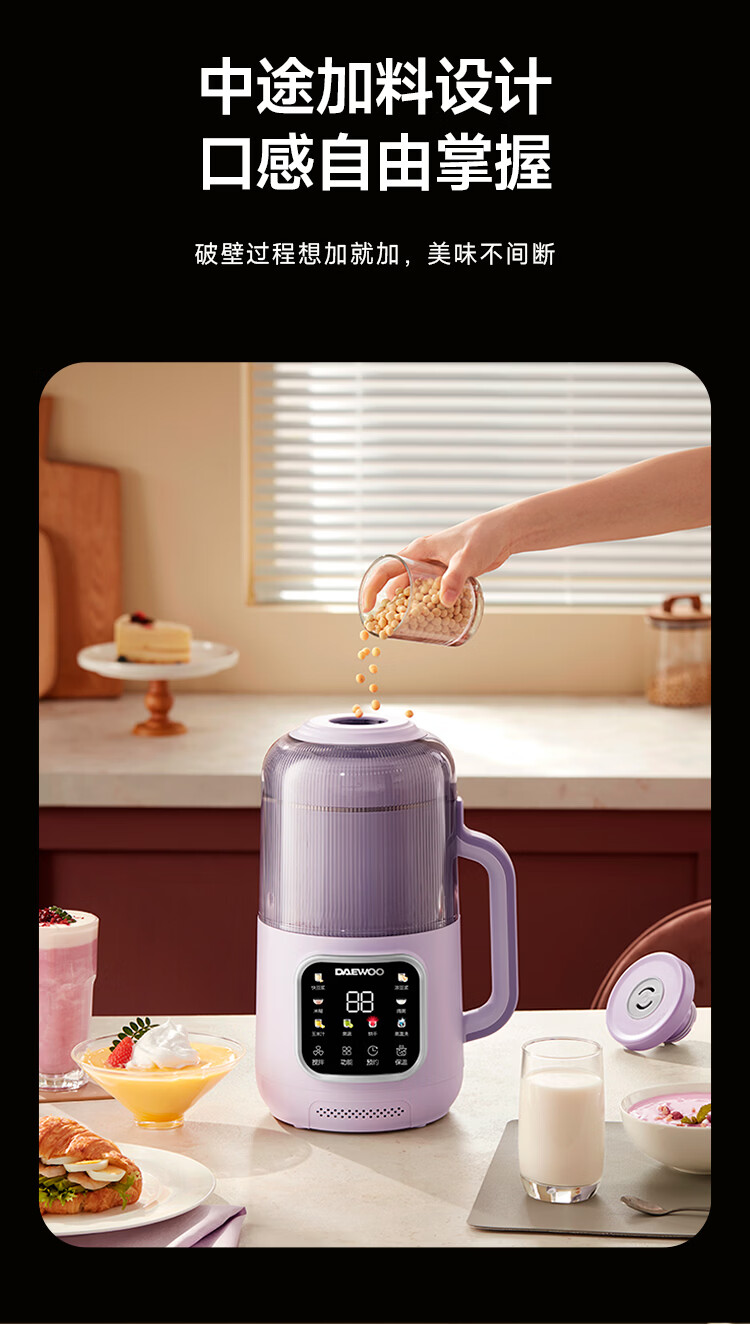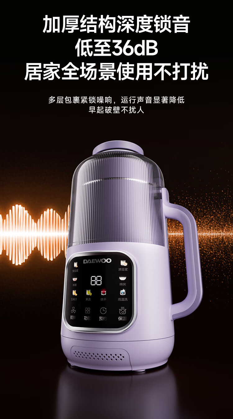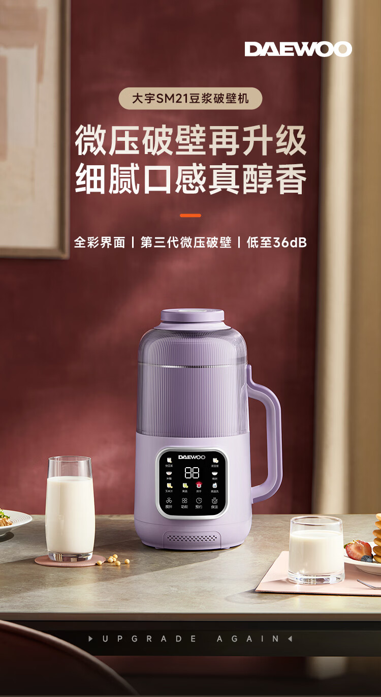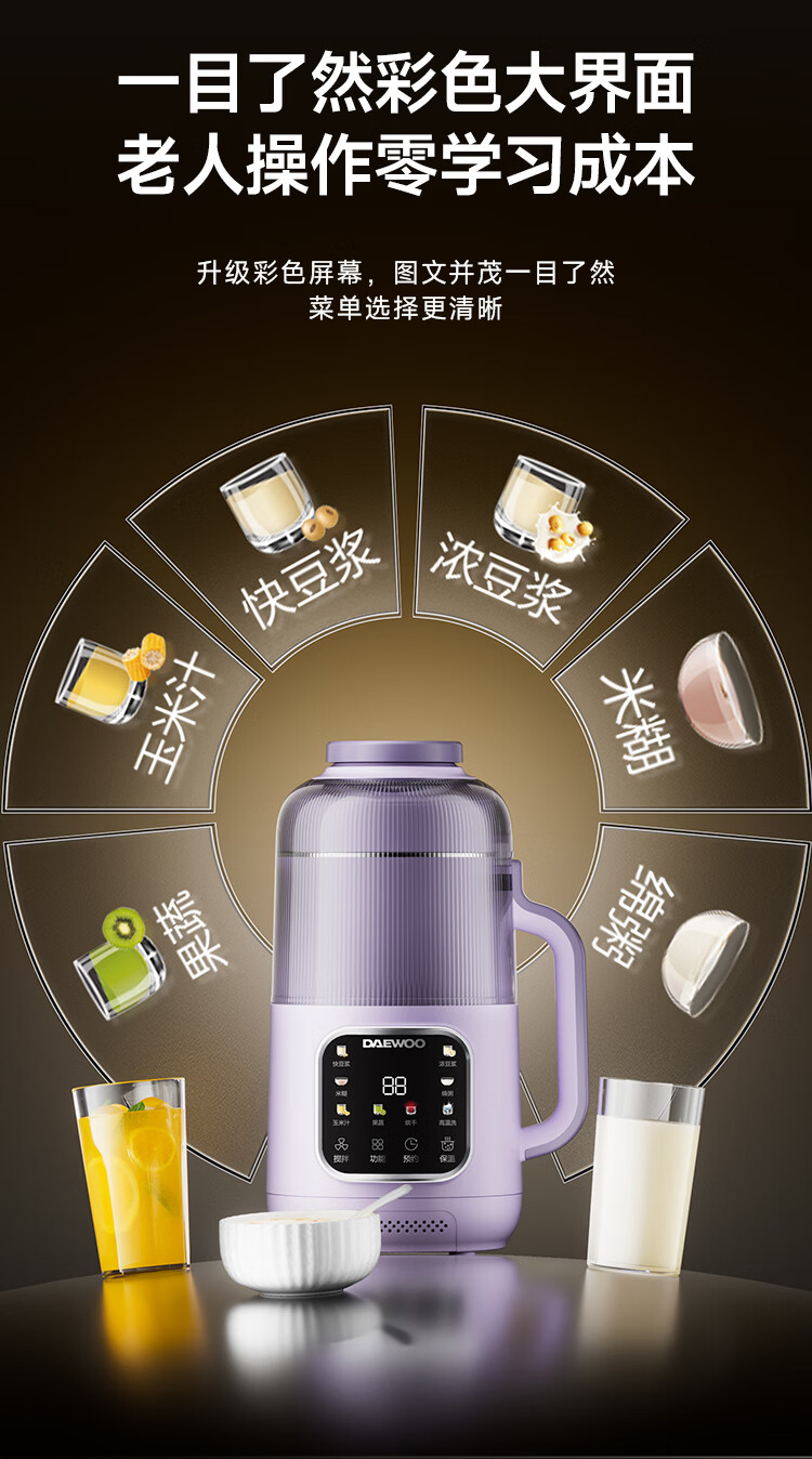 大宇(DAEWOO)【2026年热销推荐】家用破壁机轻音家用豆浆机料理机全自动免煮免滤五谷杂粮大容量榨汁机SM21 25年1.2L炫彩大屏MAX(紫色)