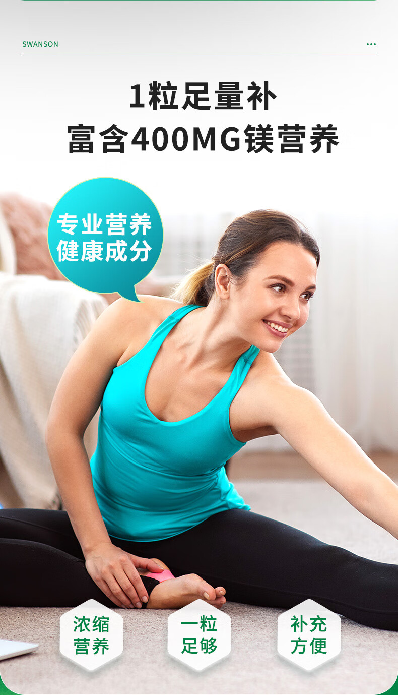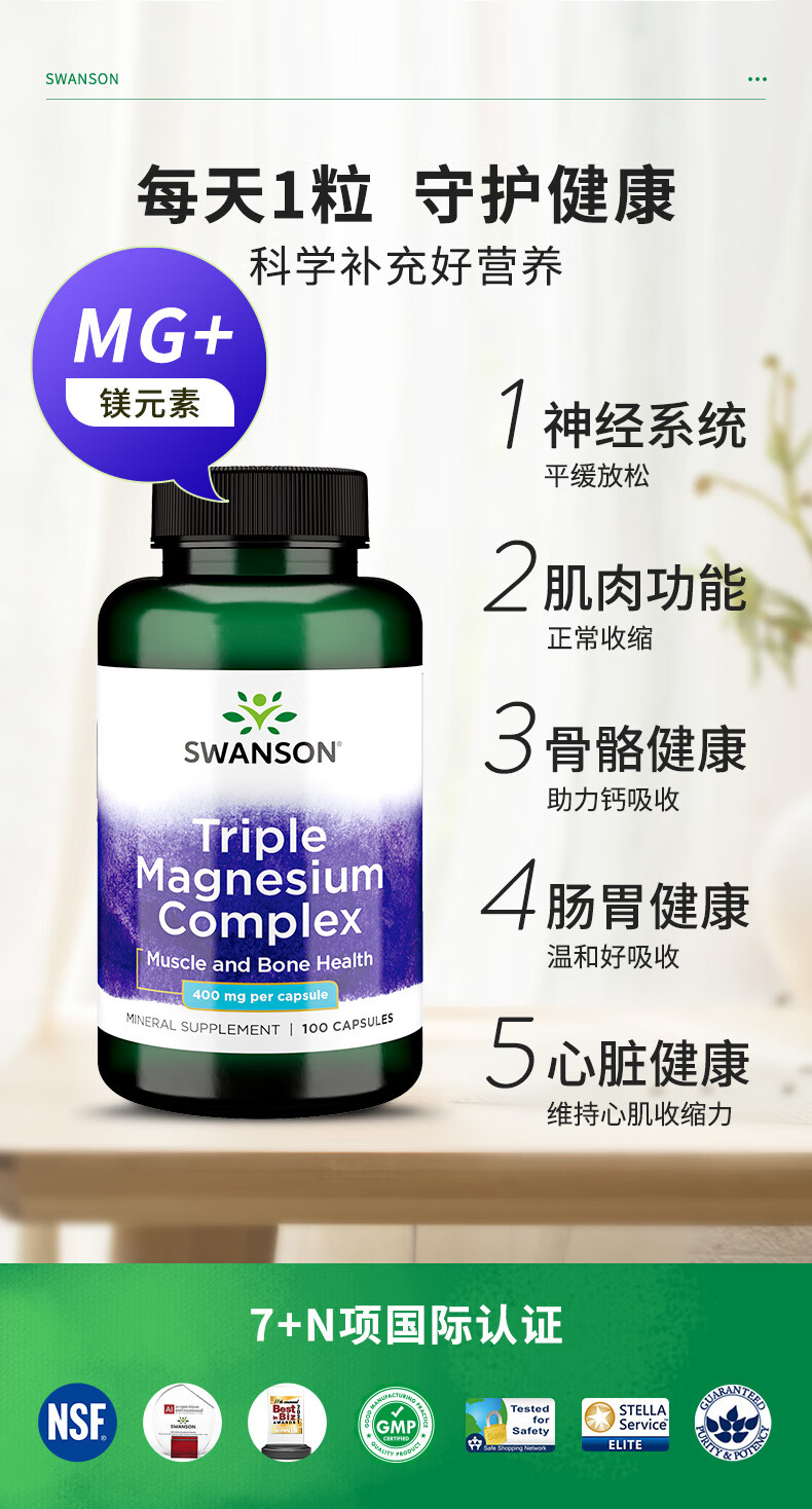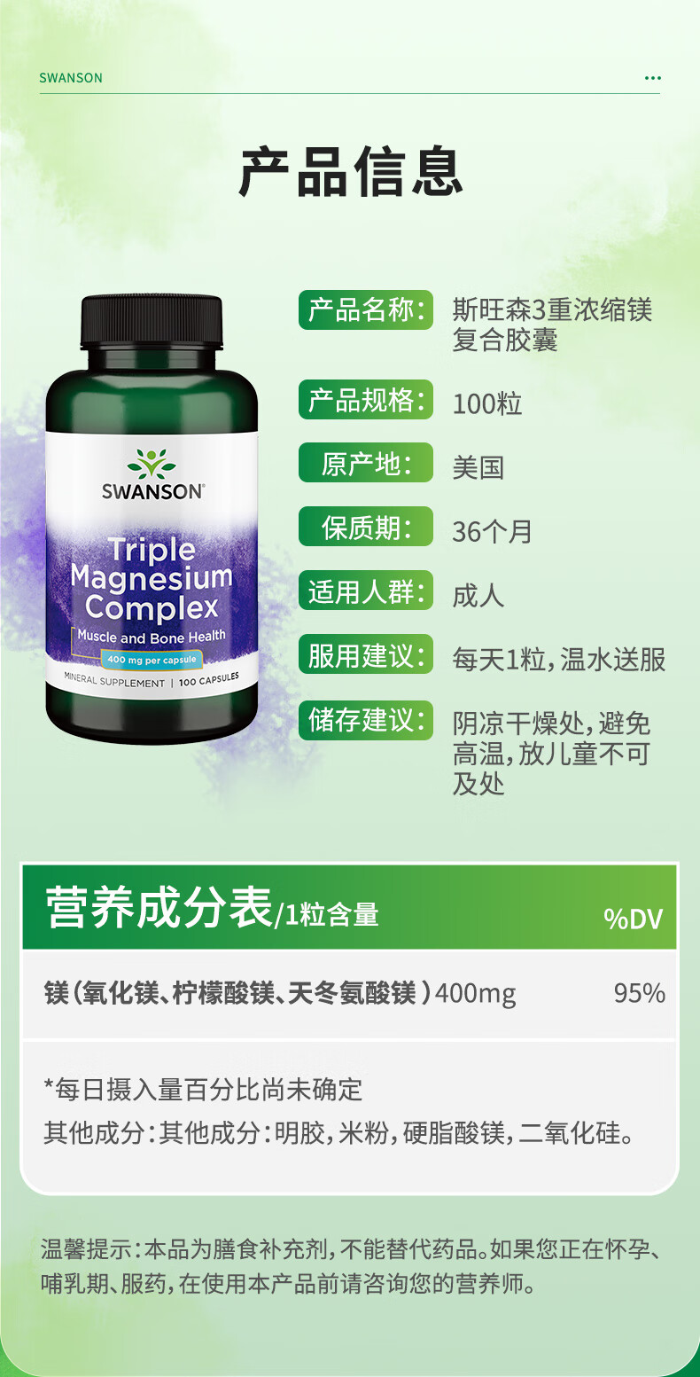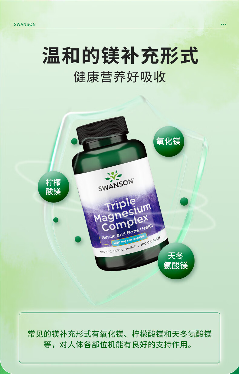 斯旺森(SWANSON)三重复合镁补充剂400mg100粒 放松肌肉抽筋舒张血管 舒缓情绪压力 3重浓缩镁营养100粒