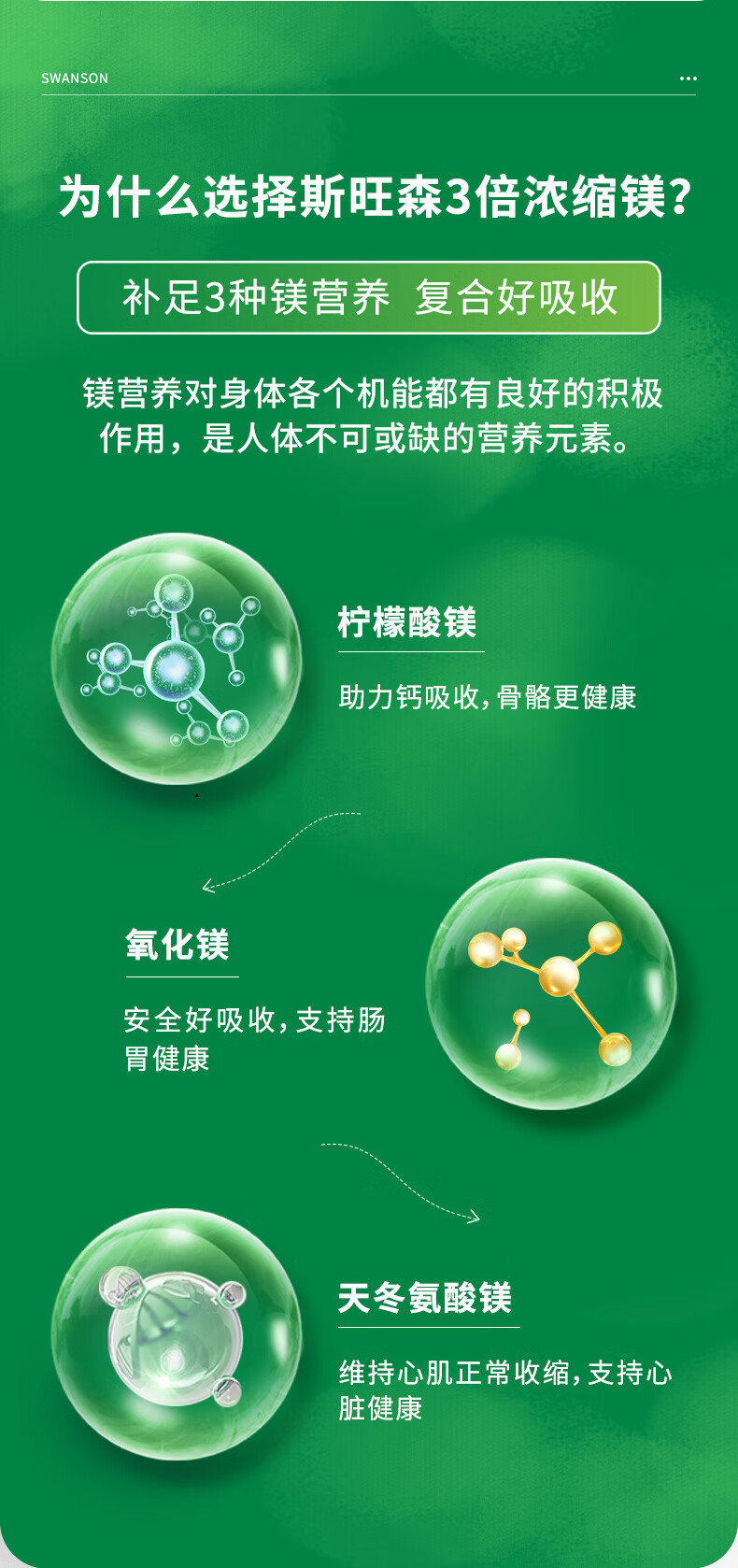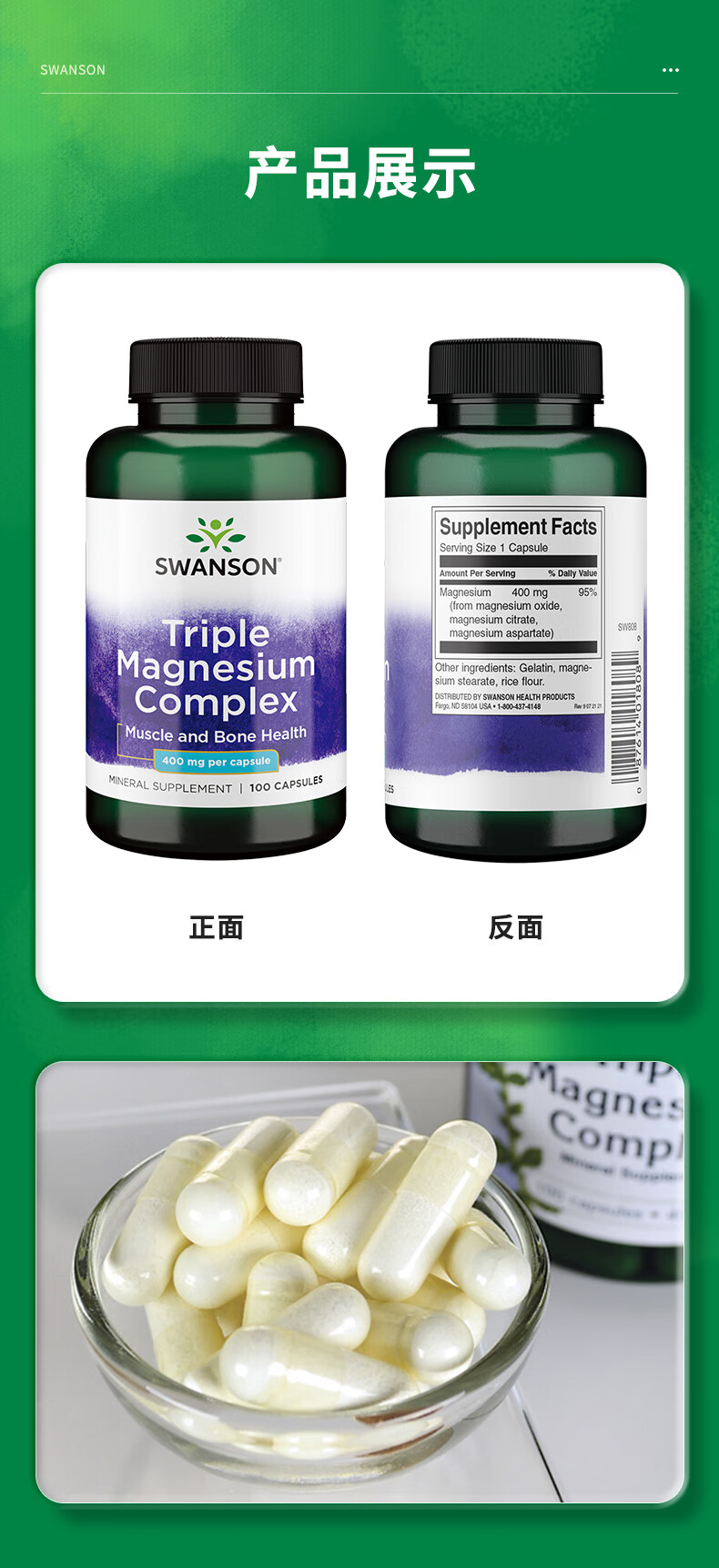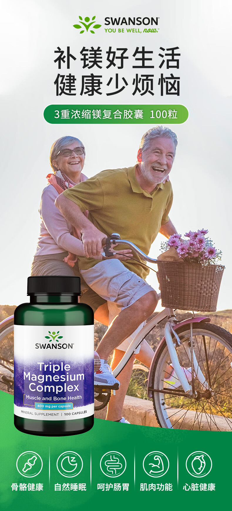 斯旺森(SWANSON)三重复合镁补充剂400mg100粒 放松肌肉抽筋舒张血管 舒缓情绪压力 3重浓缩镁营养100粒