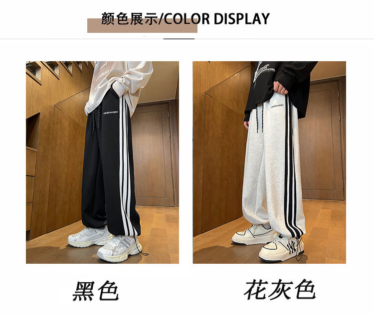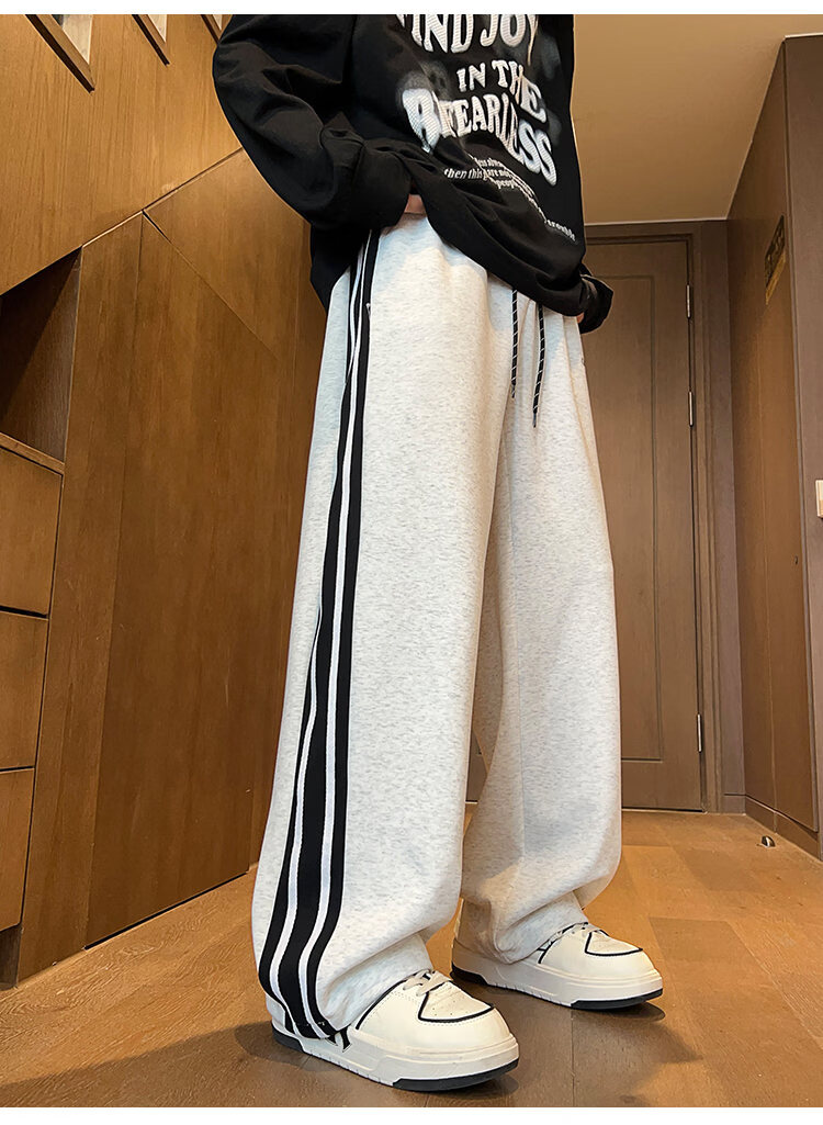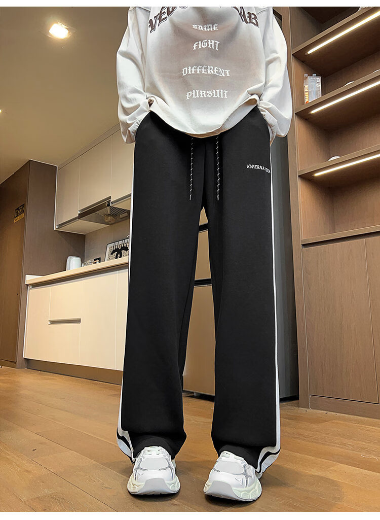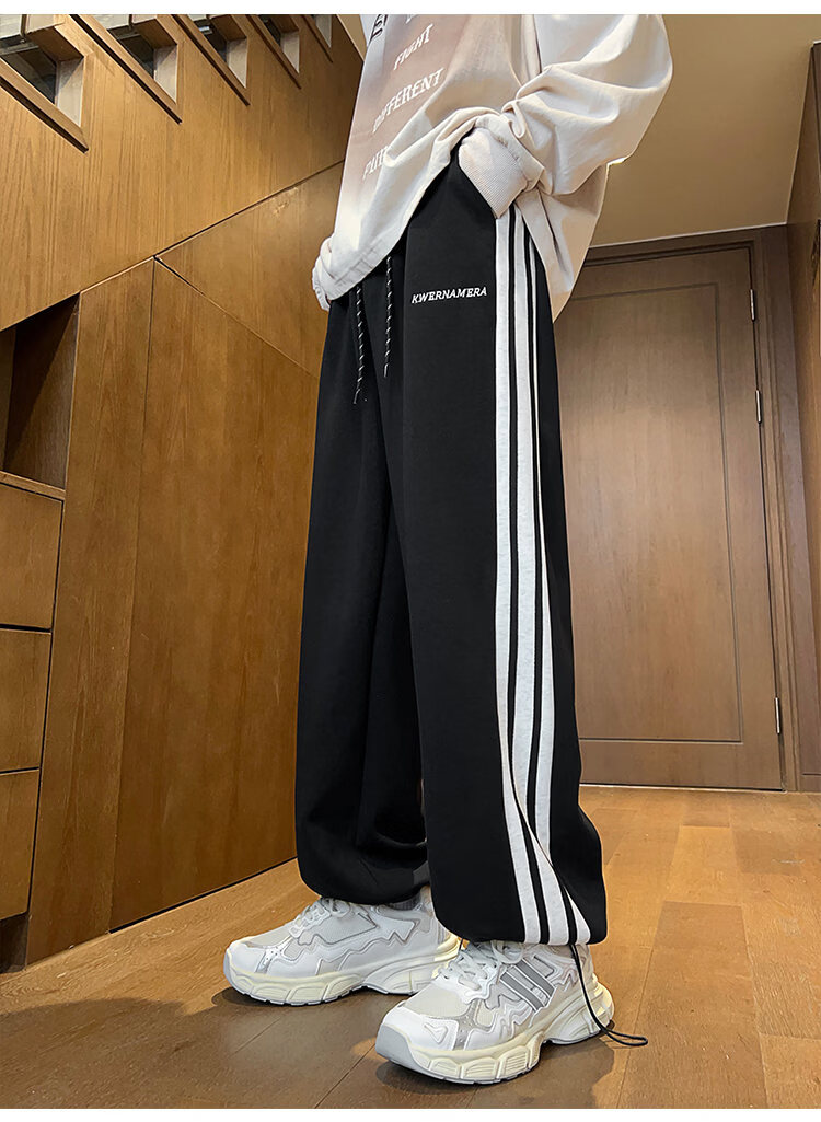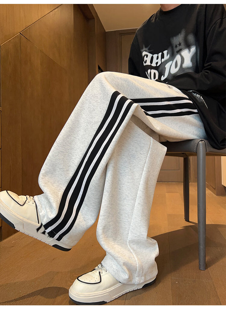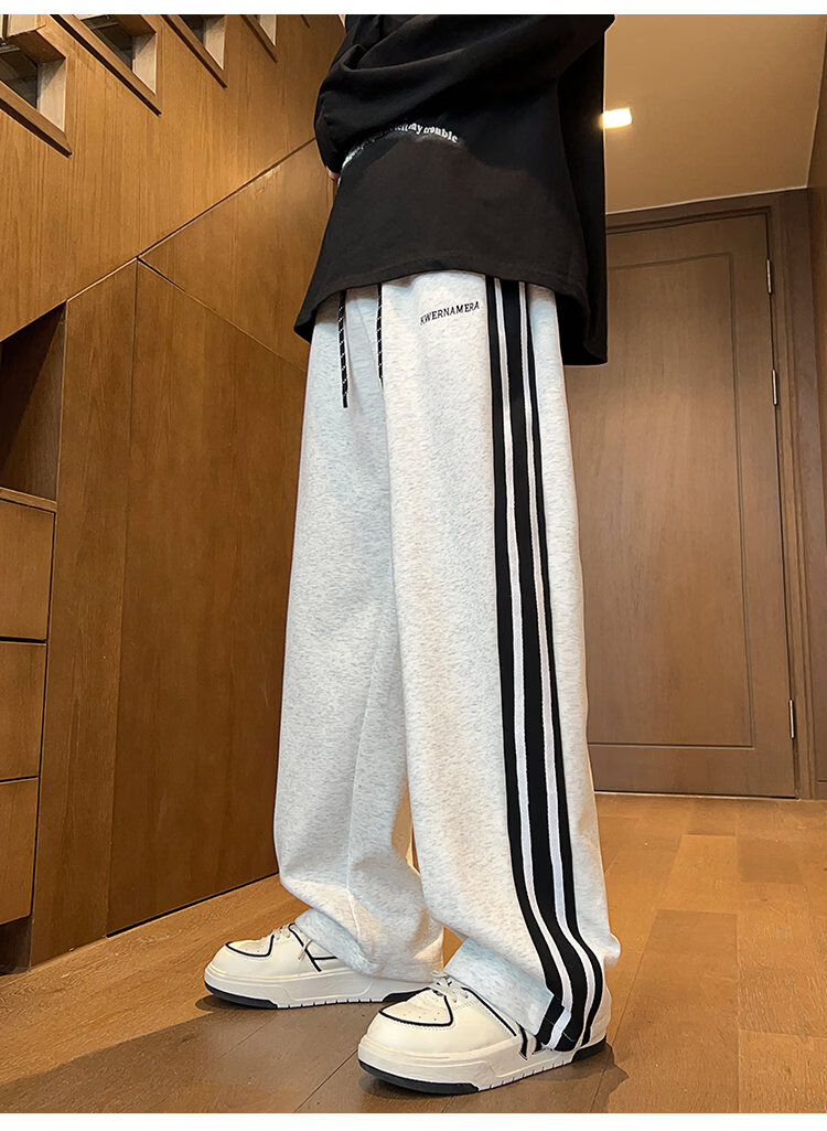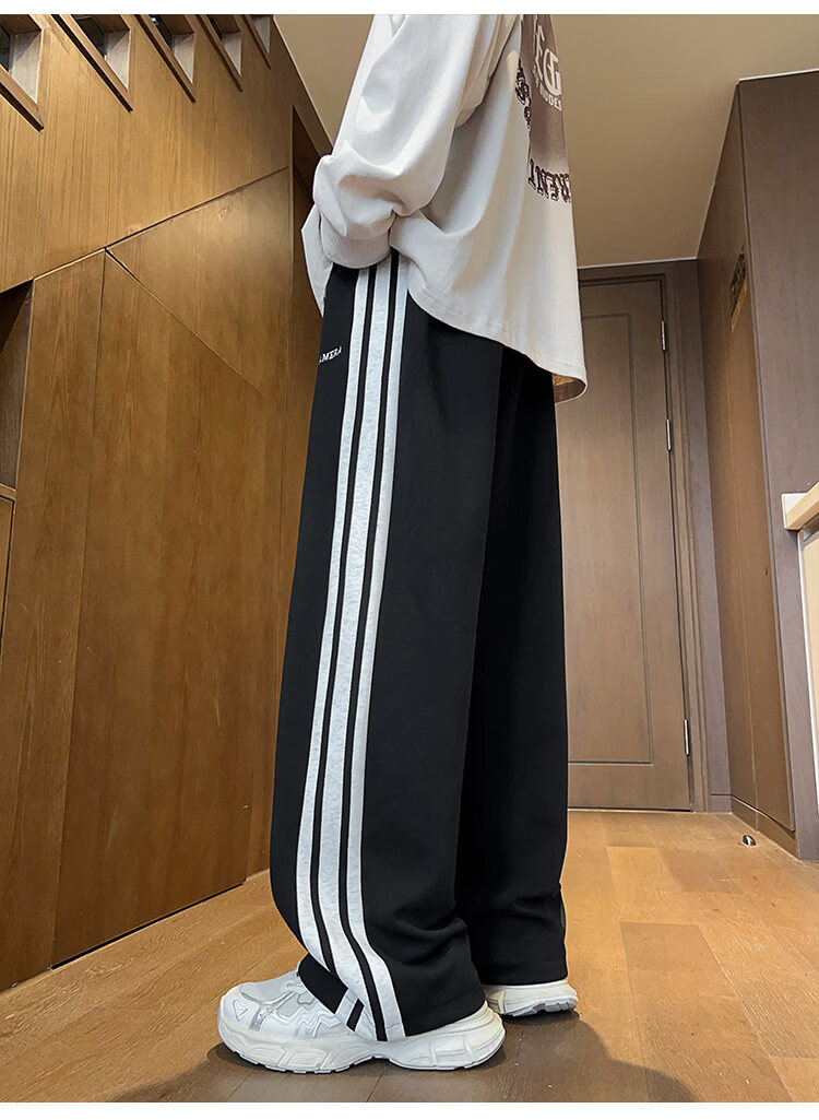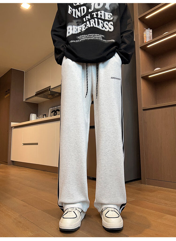 月伊纺春季新款宽松直筒休闲裤男士潮流百搭条纹卫裤青年织带拼接运动裤 花灰色 3XL