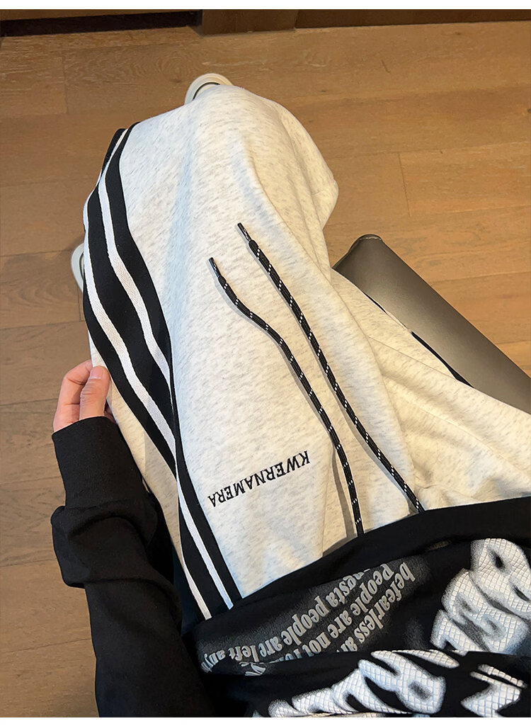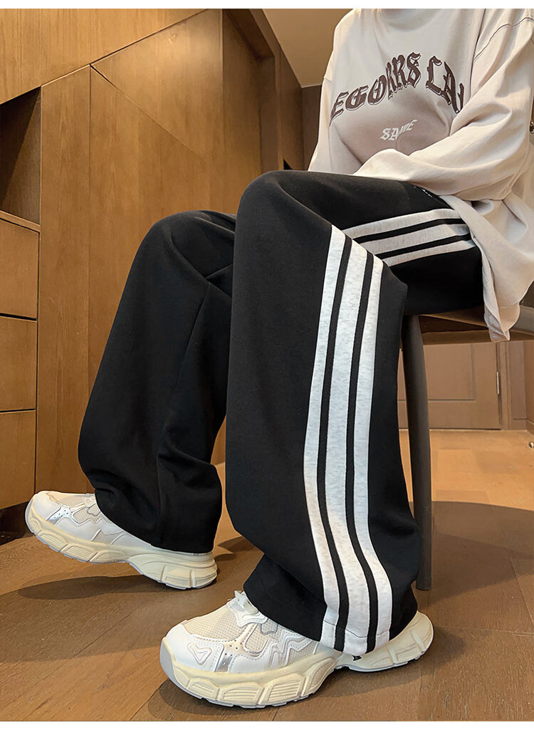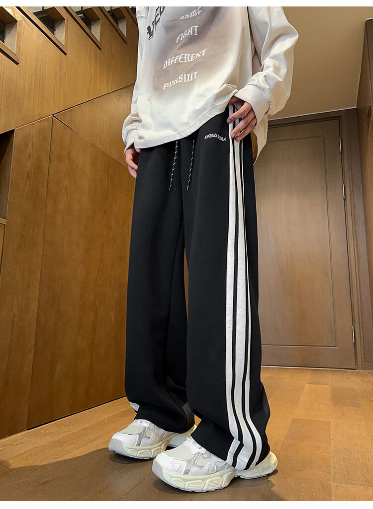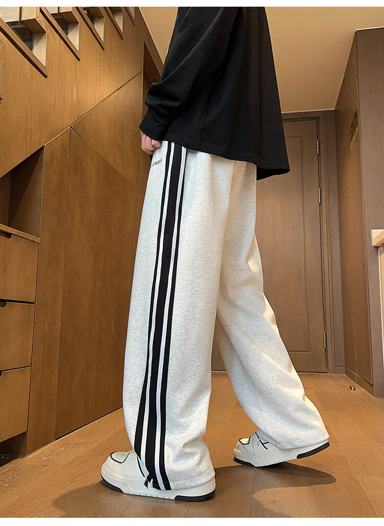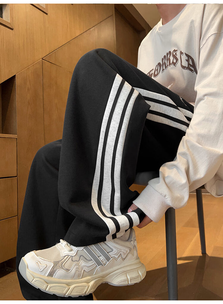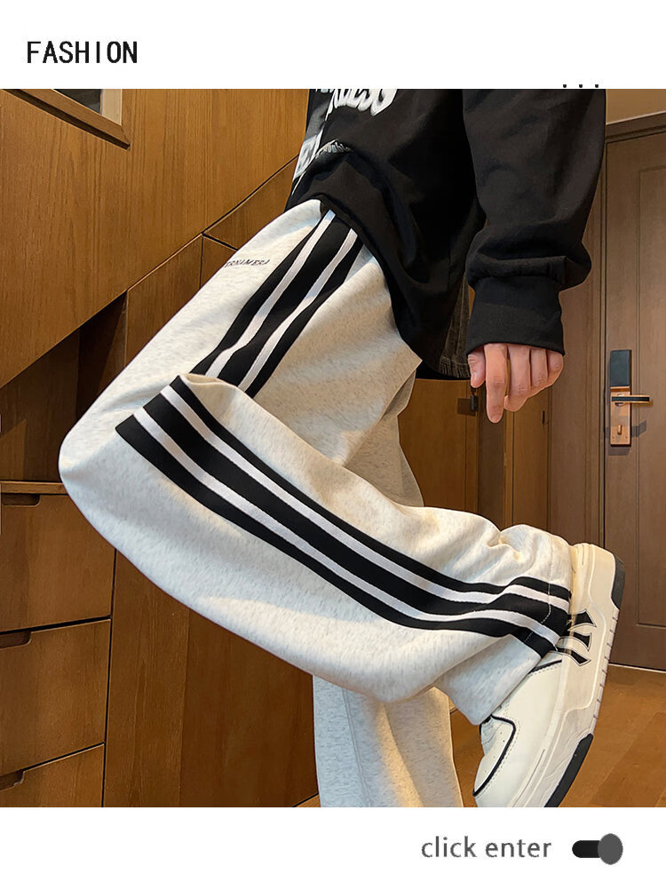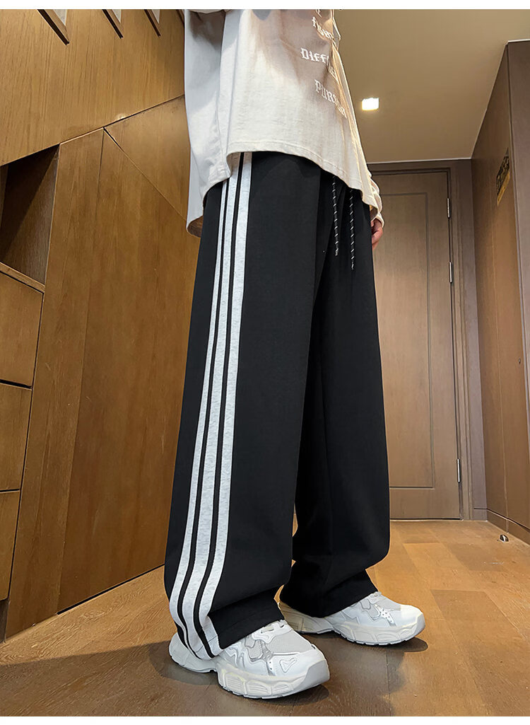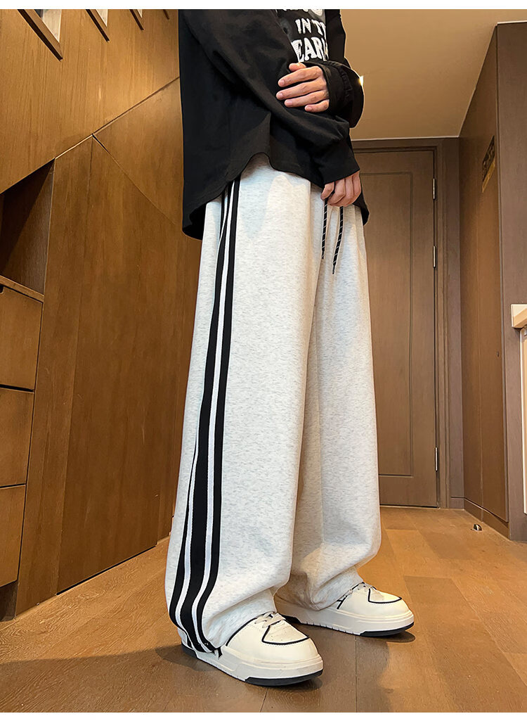 月伊纺春季新款宽松直筒休闲裤男士潮流百搭条纹卫裤青年织带拼接运动裤 花灰色 3XL