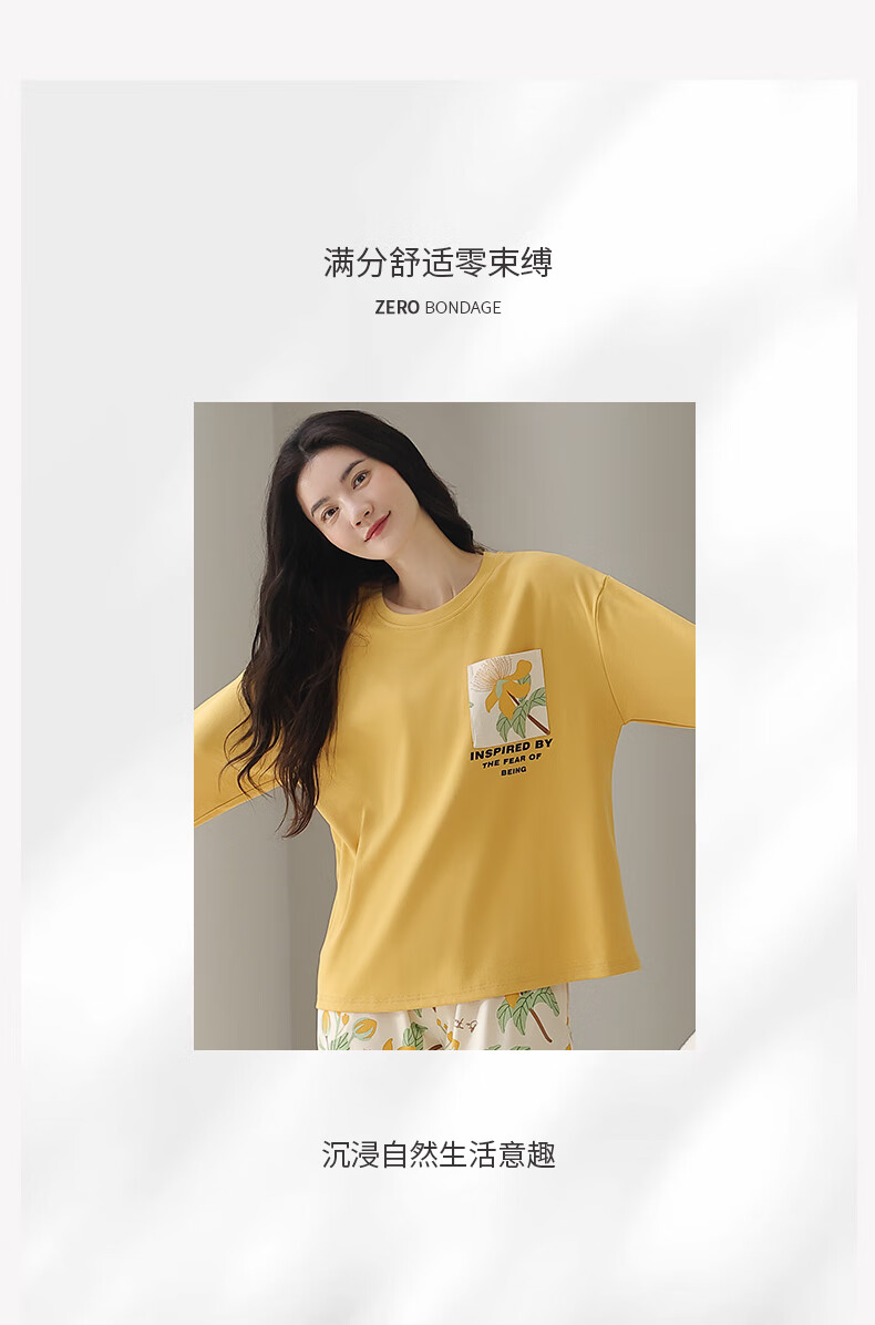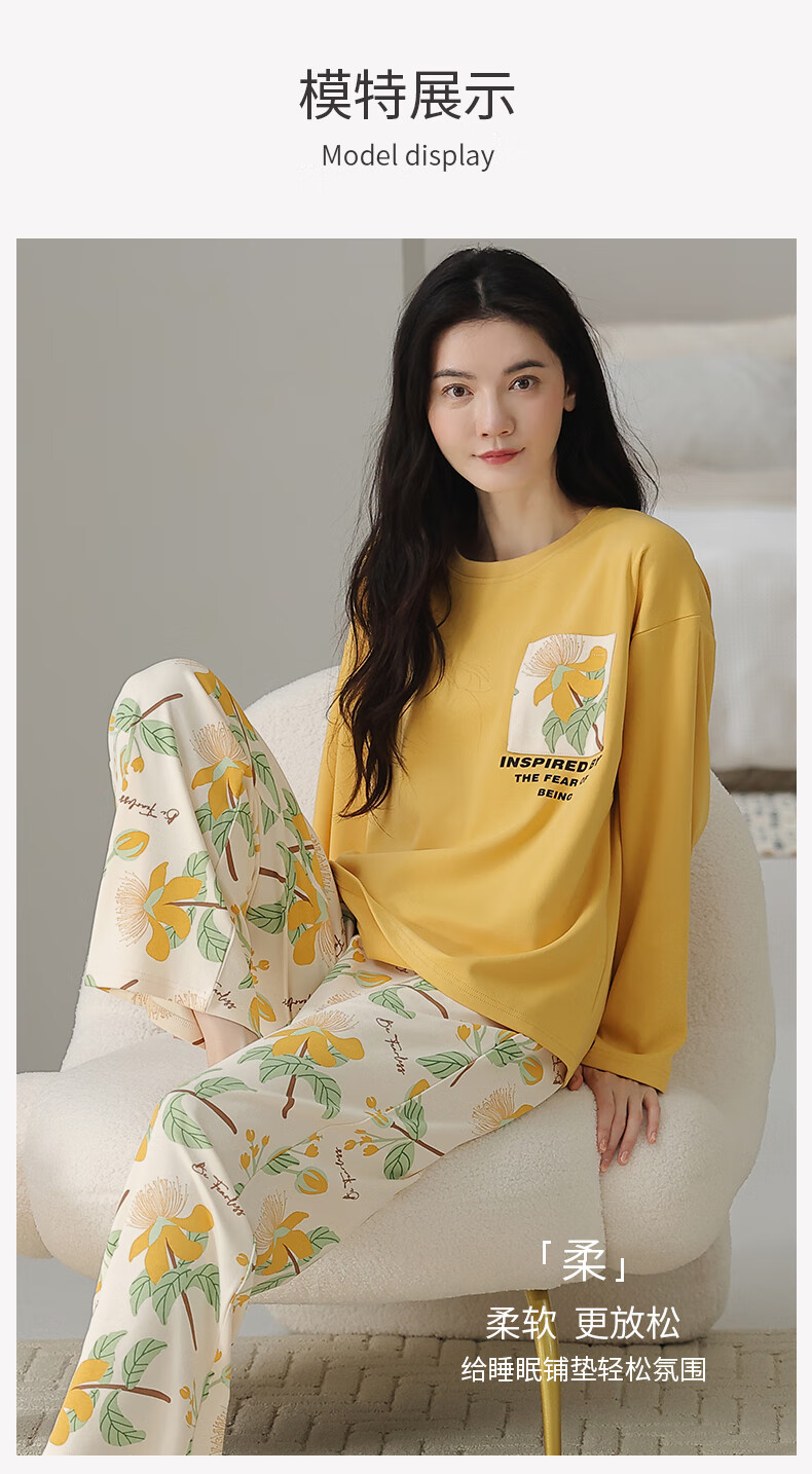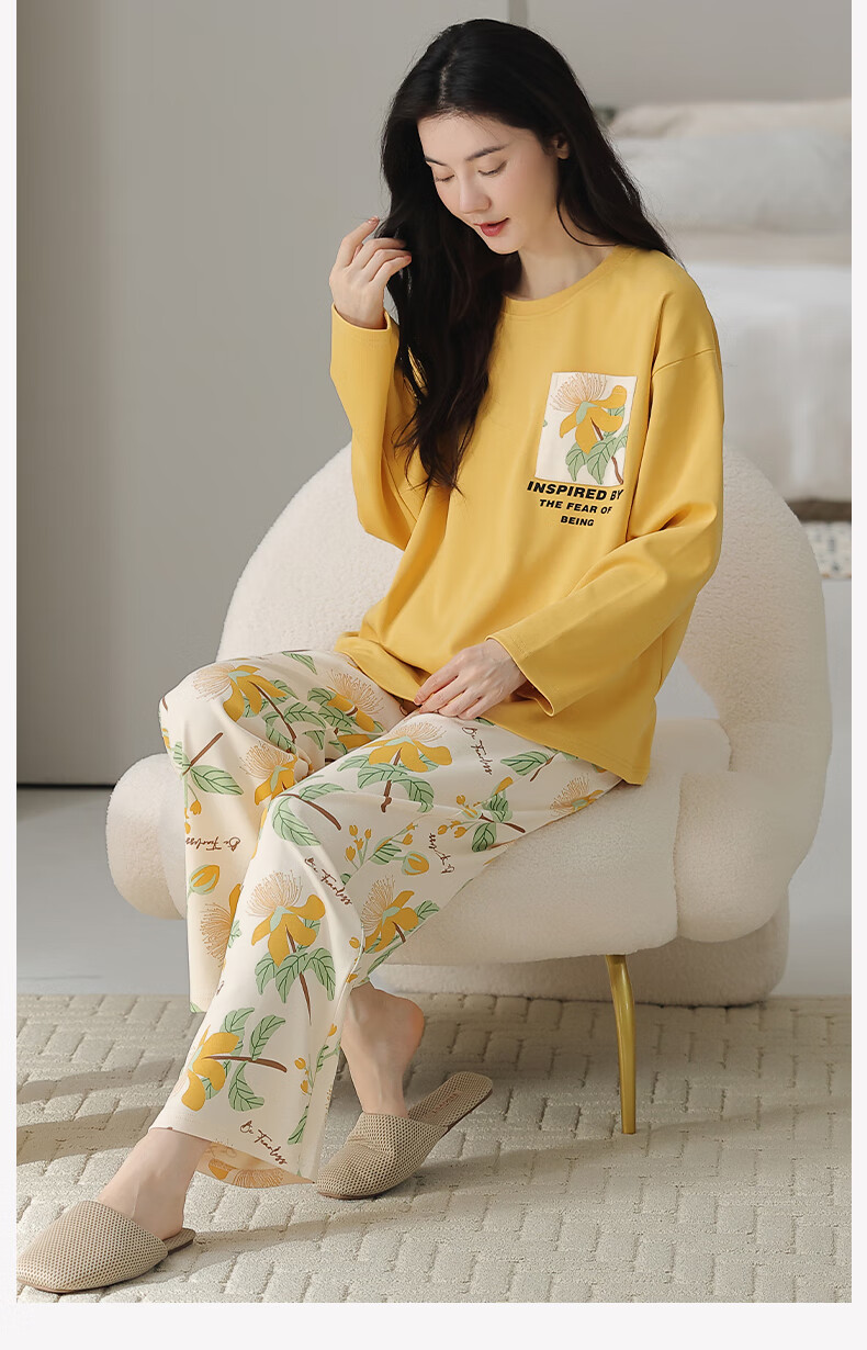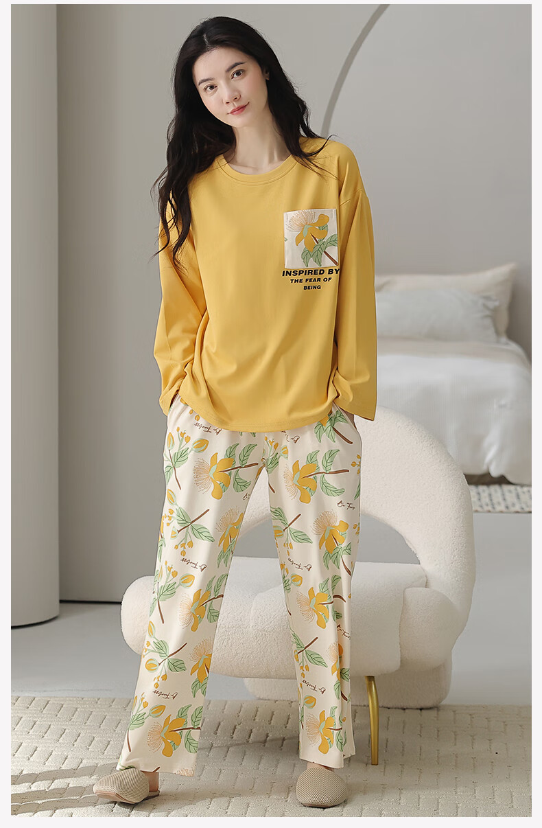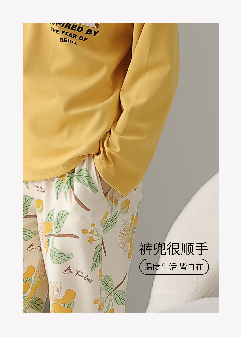 芬腾睡衣女【100%纯棉】秋冬新款圆领长袖花卉睡衣女家居服套装 黄色 L