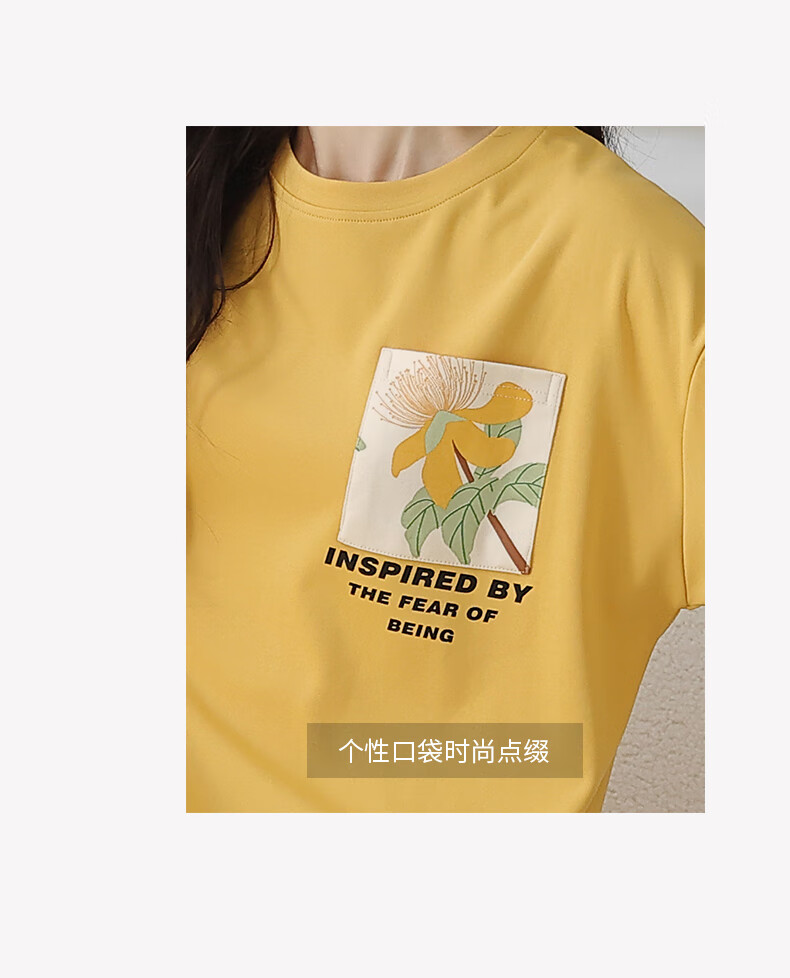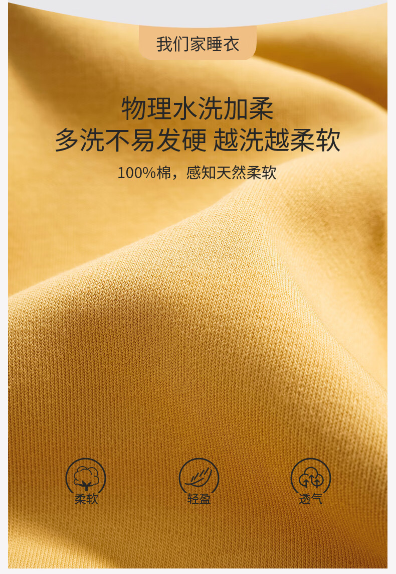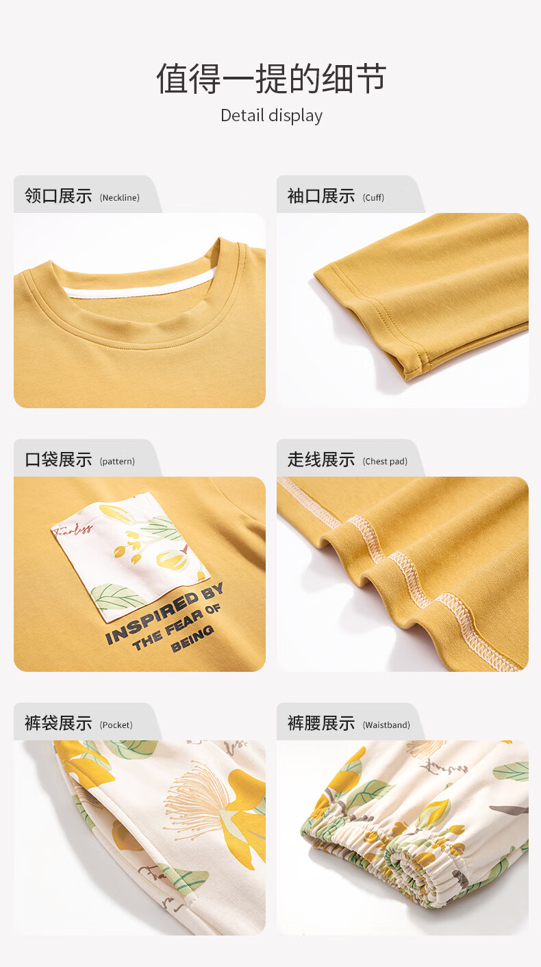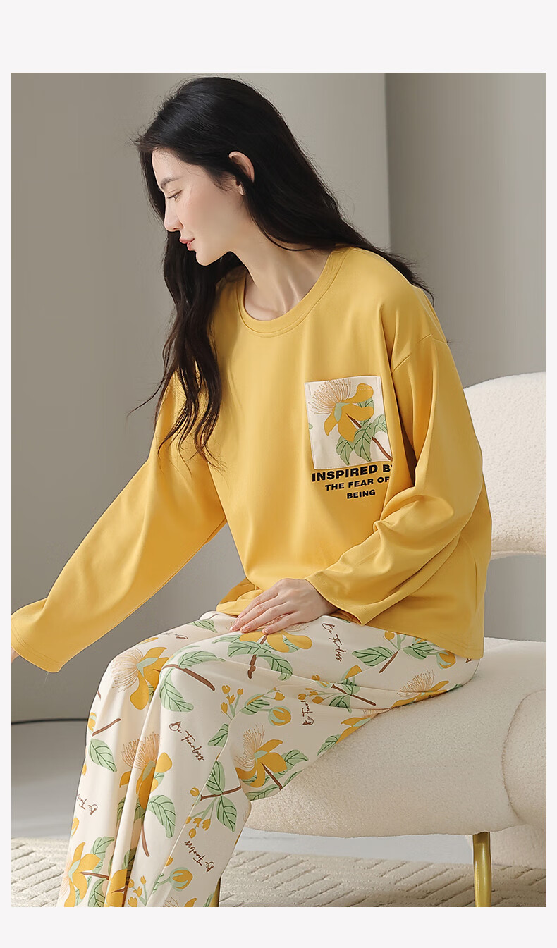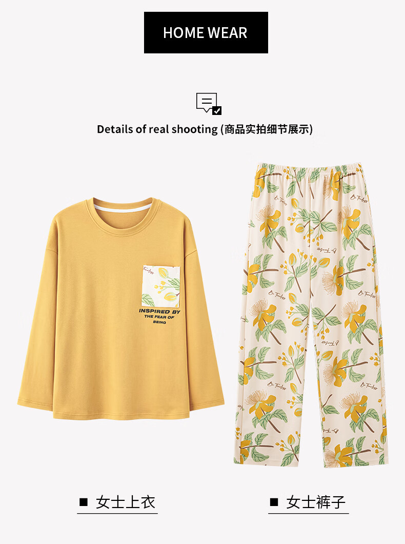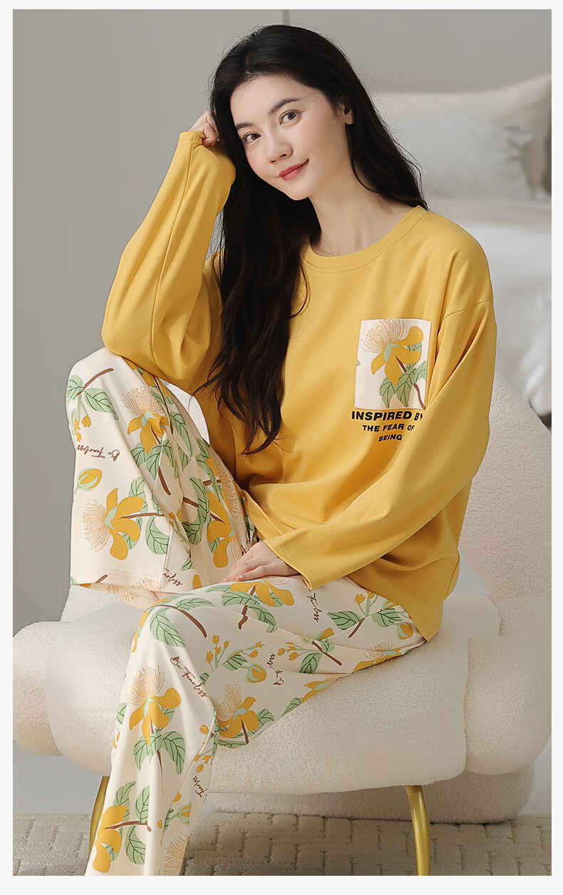 芬腾睡衣女【100%纯棉】秋冬新款圆领长袖花卉睡衣女家居服套装 黄色 L