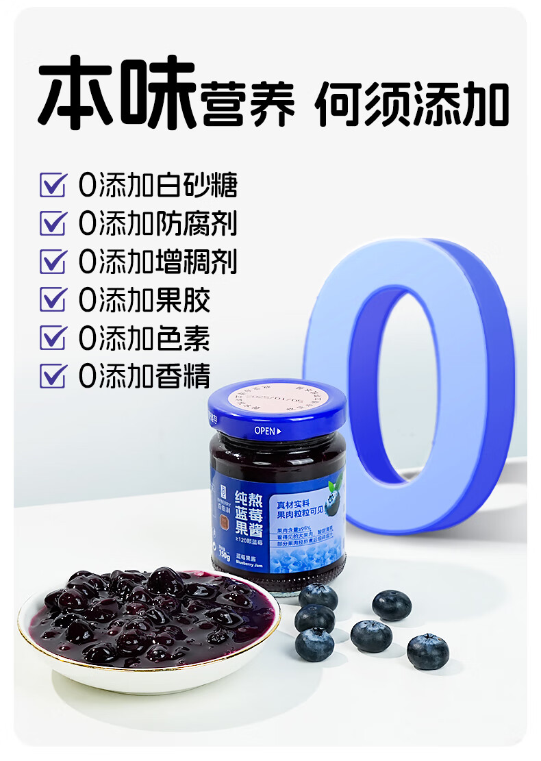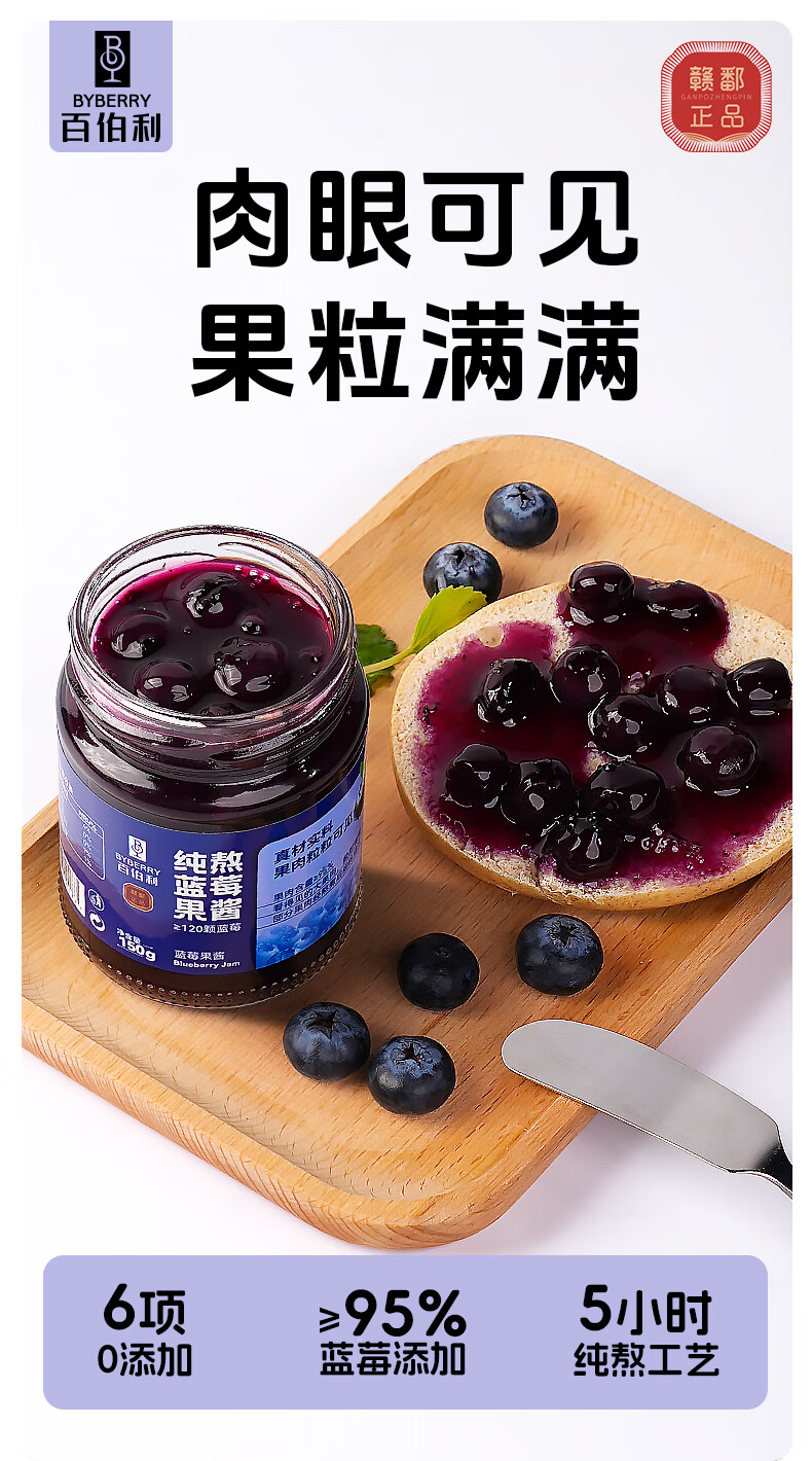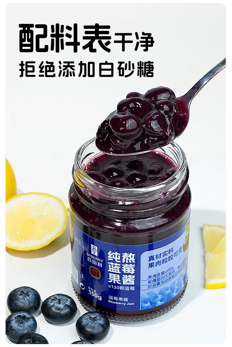 百伯利蓝莓果酱0白砂糖0脂纯熬95%大颗粒蓝莓儿童早餐涂面包吐司酱150g
