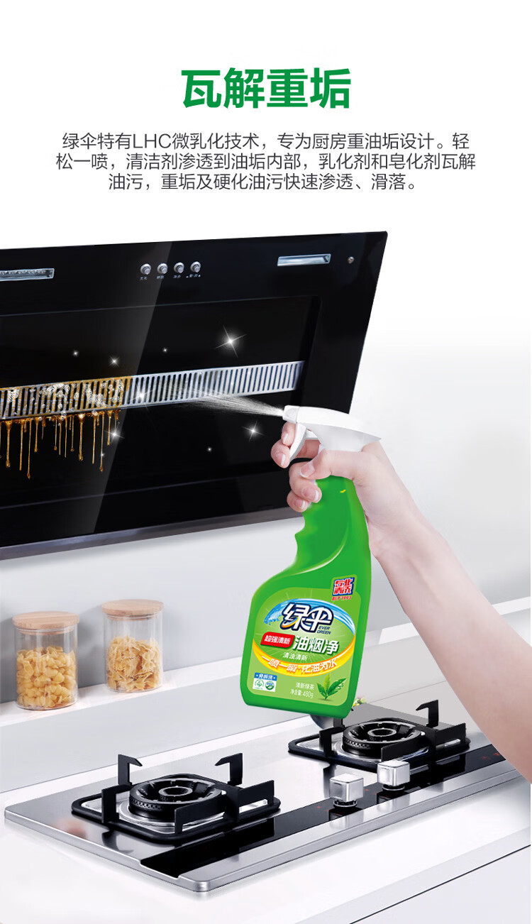 绿伞超强油烟净(绿茶香)餐厅厨房油烟机清洁剂 免拆洗去重油 高效除菌 480g*1瓶+450g*2袋