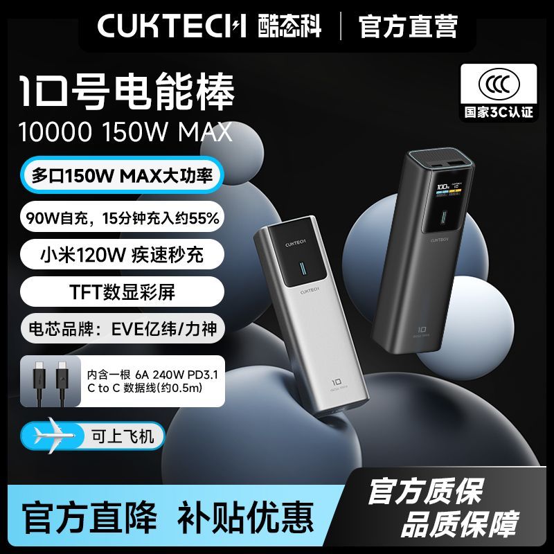 酷态科充电宝10号电能棒电芯10000毫安150W大功率适用小米17苹果