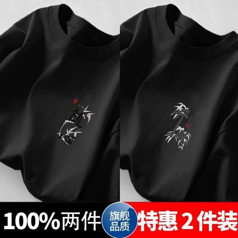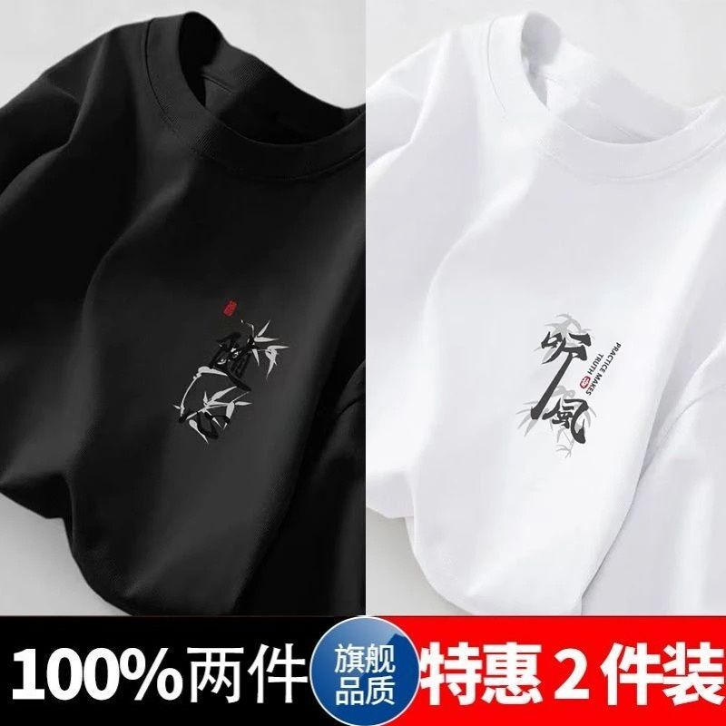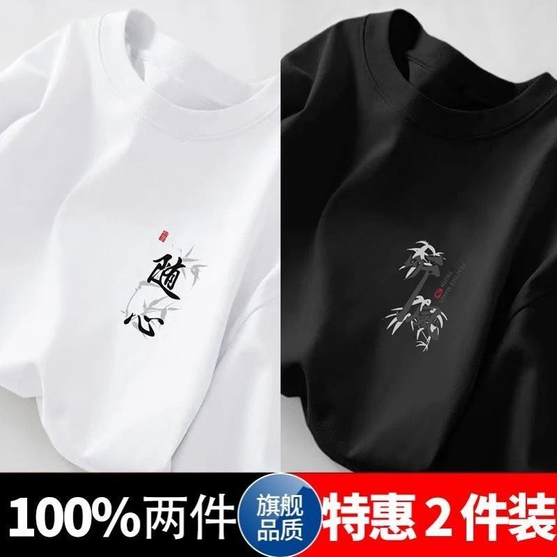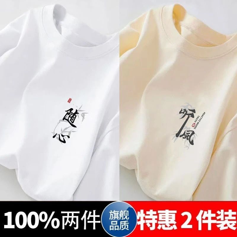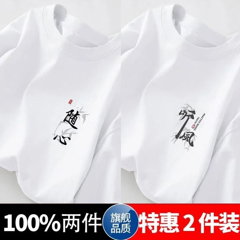 100%短袖五分夏季新款国潮宽松半袖百搭简约青少年港风印花上衣